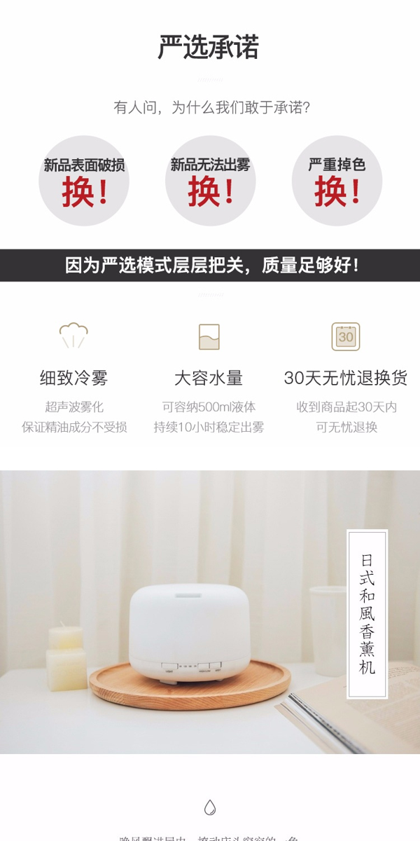 超声波加湿器,集小夜灯,香薰机,加湿器功能为一体,500ml超大容量,持续10小时稳定出雾,超声波雾化,加入精油不损伤精油精华成分,30分贝静音工作,不影响夜间睡眠,可设置明暗2种灯光模式,夜间当做小夜灯用也是合适的。3种定时模式,缺水自动断电。浓浓无印良品风,简约质感。