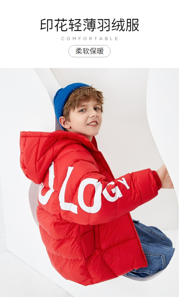 收绳连帽设计,松紧袖口不易灌风,进一步提升保暖效果。简约连帽纯色款式,轻薄不压身,时尚印花设计,适合小朋友穿着。
