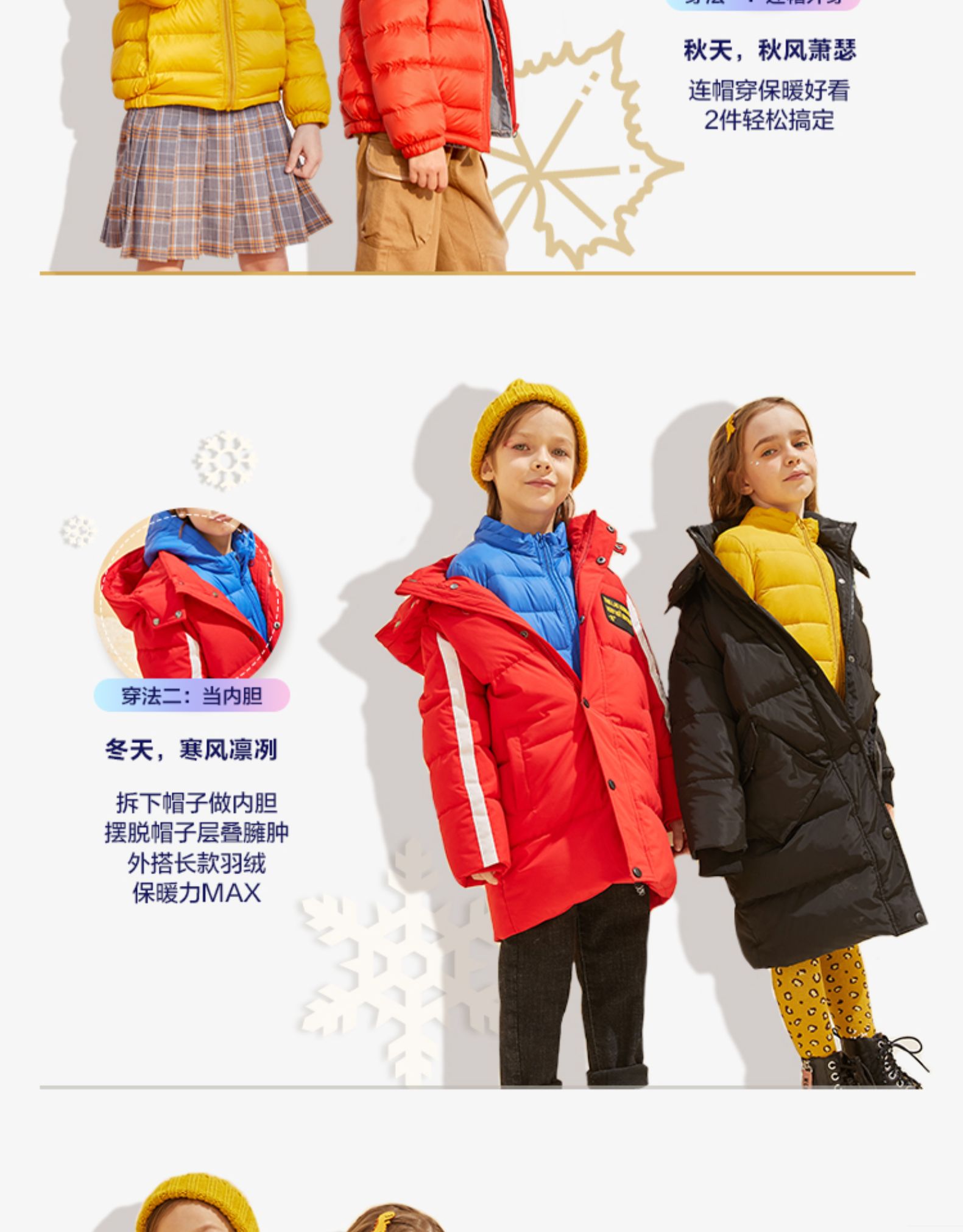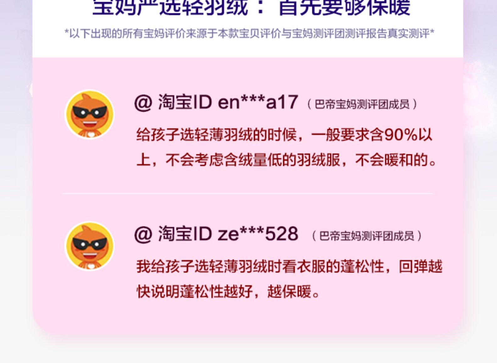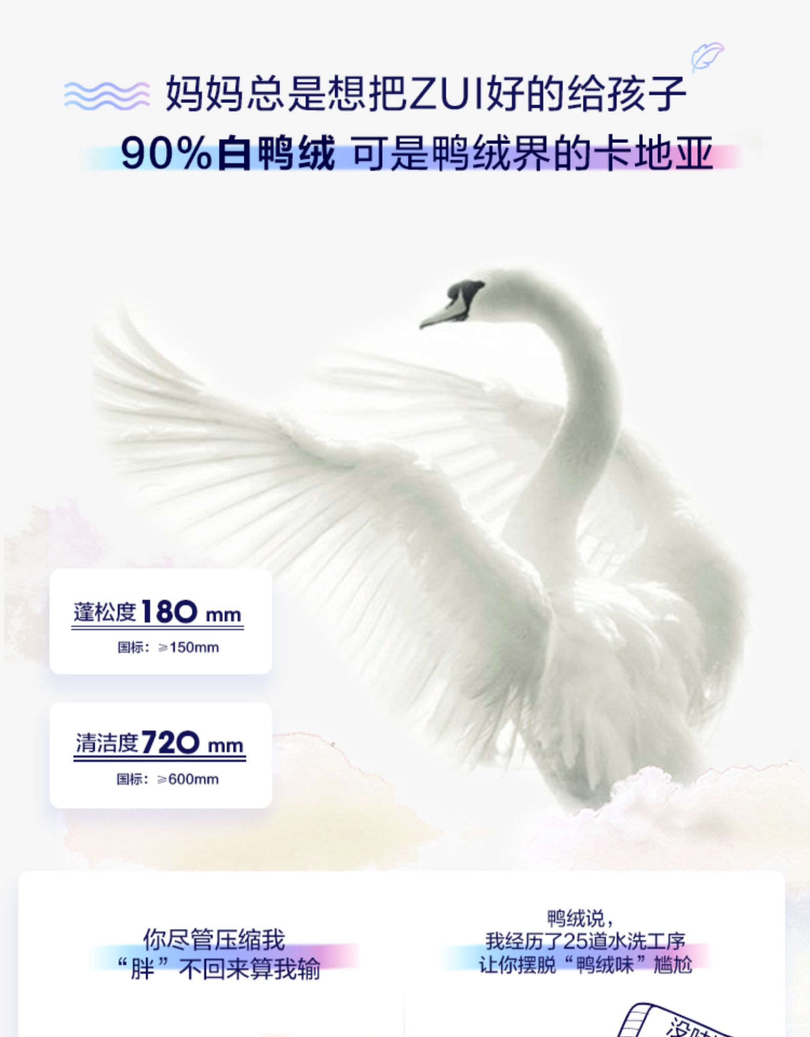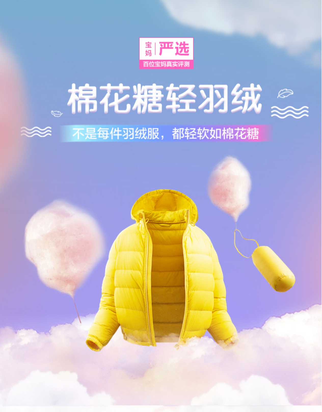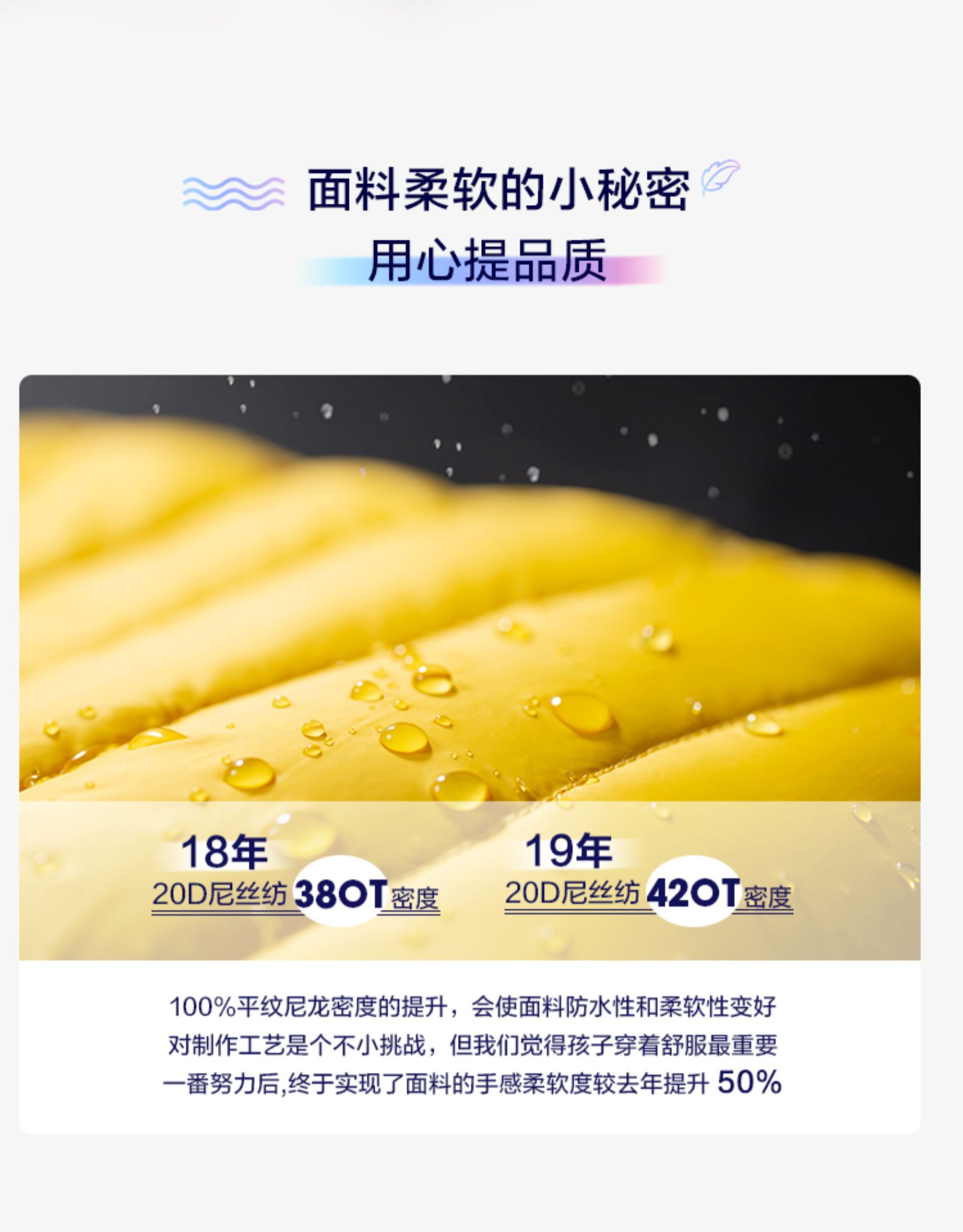 这款羽绒服主打“棉花糖”轻盈,内里填充90%白鸭绒,精选鸭腹部大绒朵羽毛,保暖效果好,轻盈不压身,小朋友没有压身束缚感,穿着更舒适。此外,羽绒经多道消毒工序处理,清洁度高,健康卫生,更为放心。