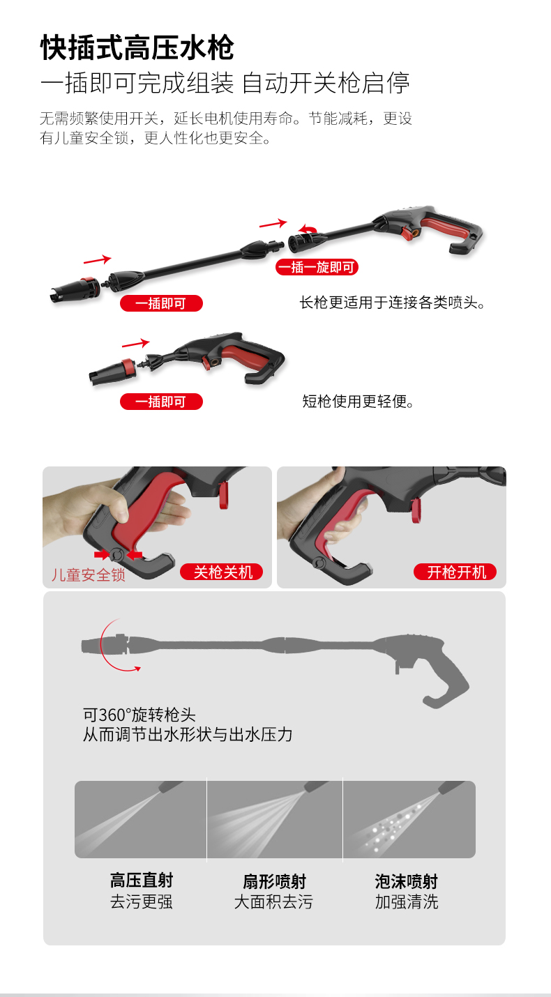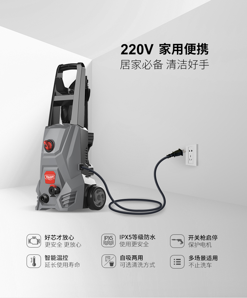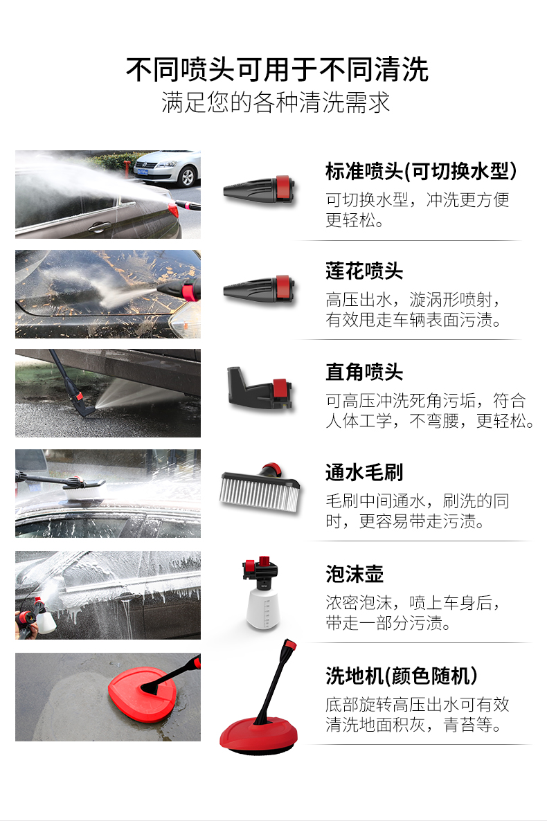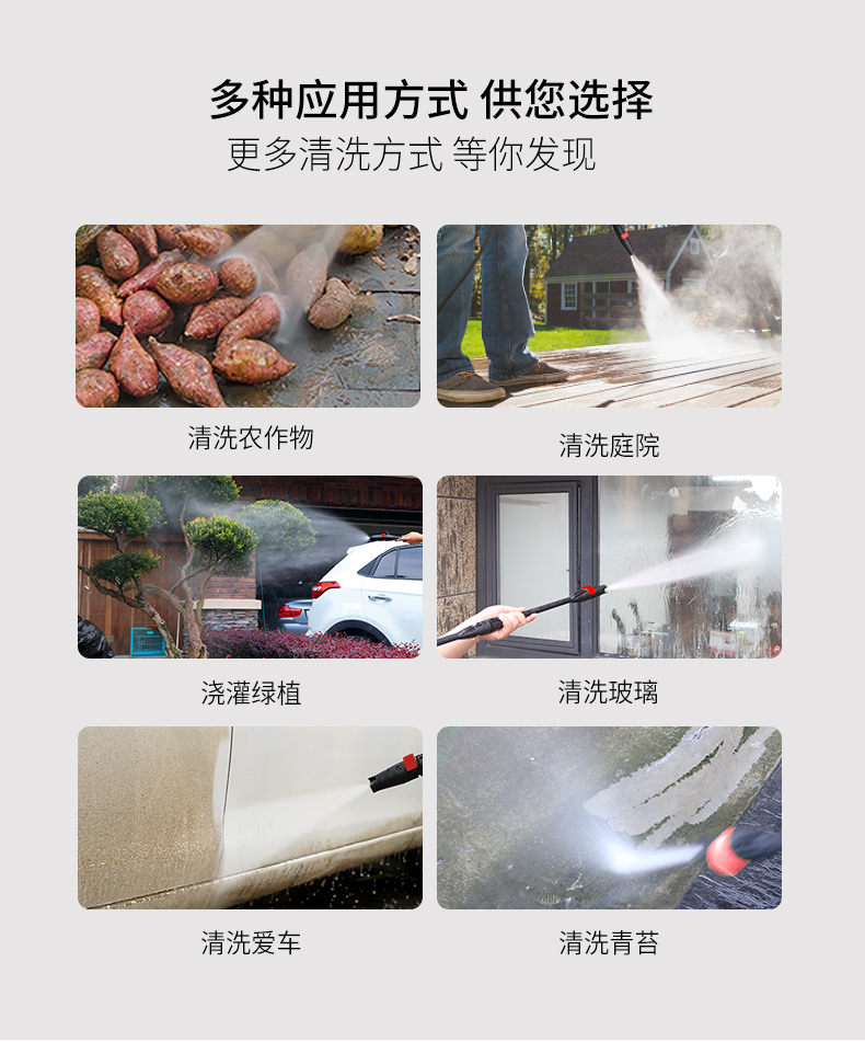 高压洗车机比普通冲水洗车洗得更干净,用水更省,内置强劲电机,冲击力强,射的更远;专业密封放水,机器IPX5级防水,360°防溅喷,喷枪带有童锁,更安全;机身小巧,可便携,除了洗车,还可以冲洗地面、庭院、自行车等多功能使用;内置智能温度感应器,当温度超过一定热量,自动断电。