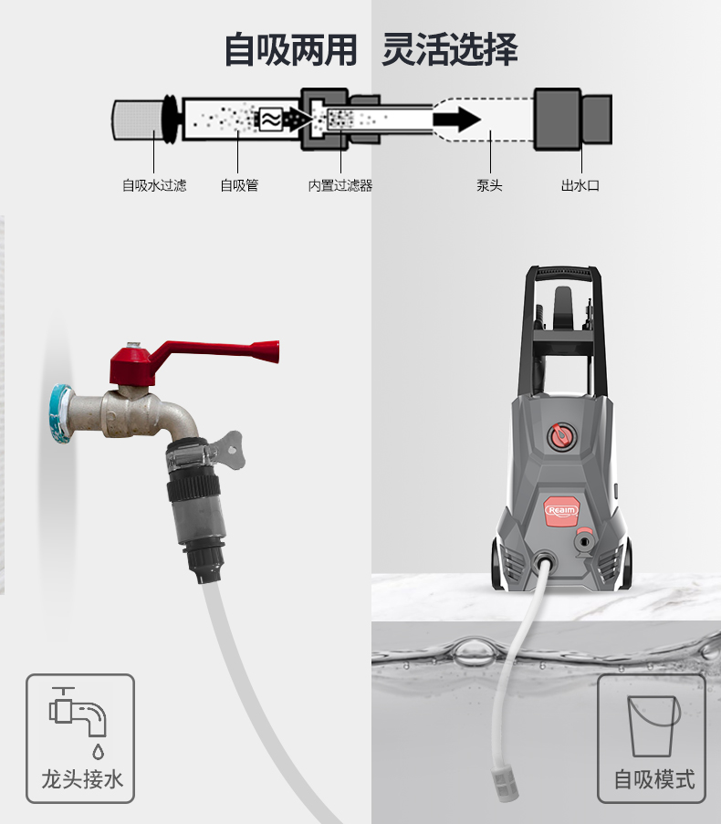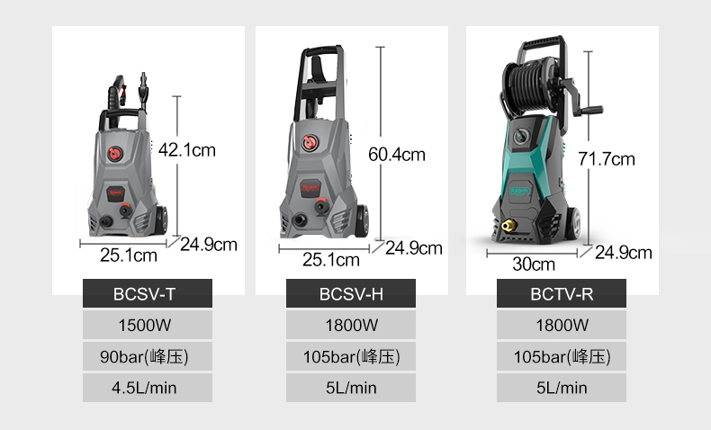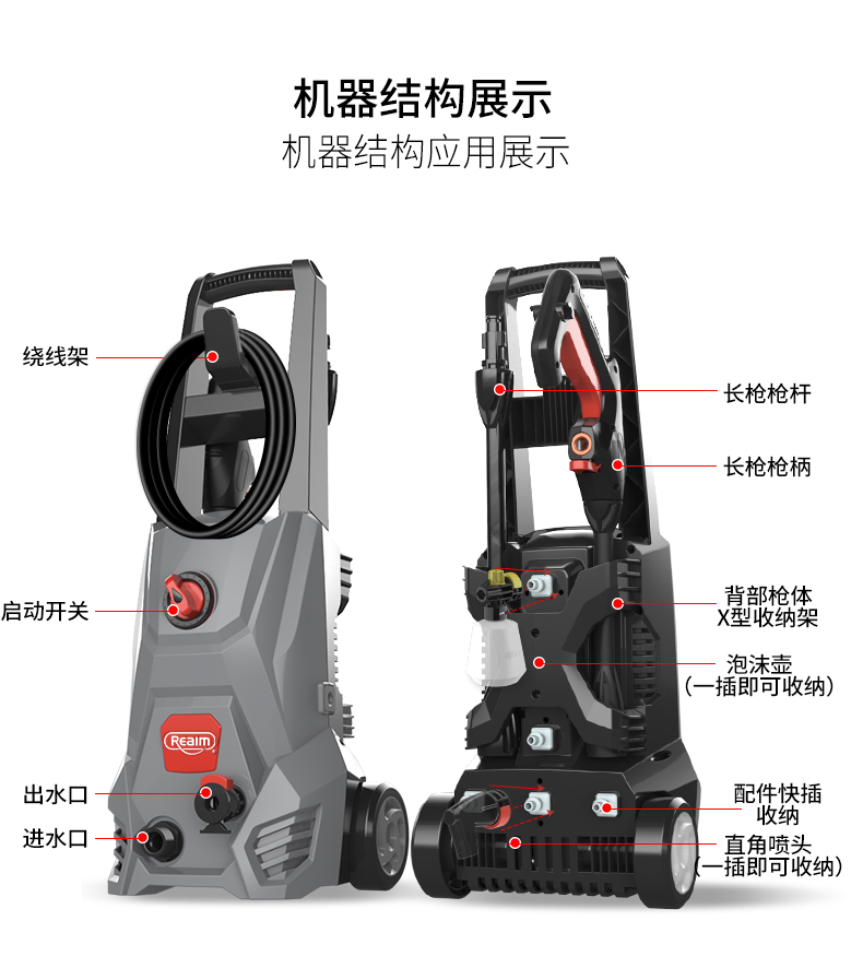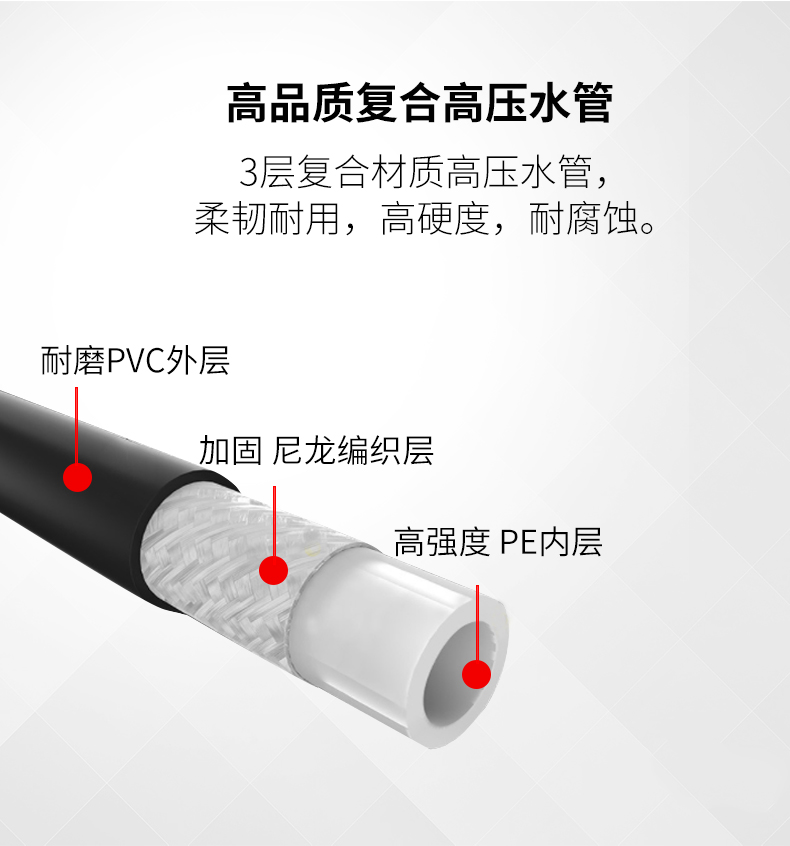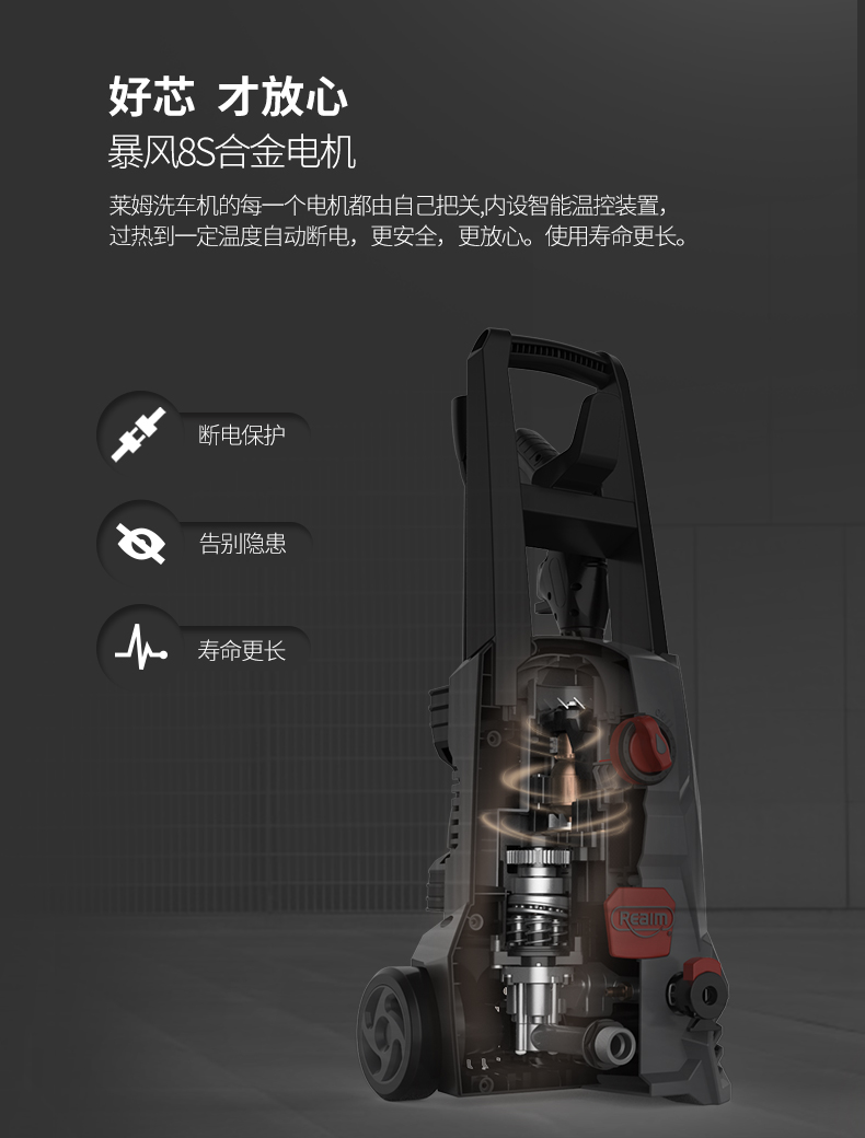 高压洗车机比普通冲水洗车洗得更干净,用水更省,内置强劲电机,冲击力强,射的更远;专业密封放水,机器IPX5级防水,360°防溅喷,喷枪带有童锁,更安全;机身小巧,可便携,除了洗车,还可以冲洗地面、庭院、自行车等多功能使用;内置智能温度感应器,当温度超过一定热量,自动断电。