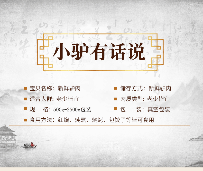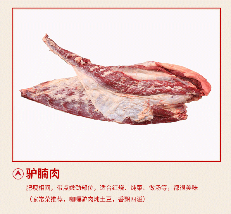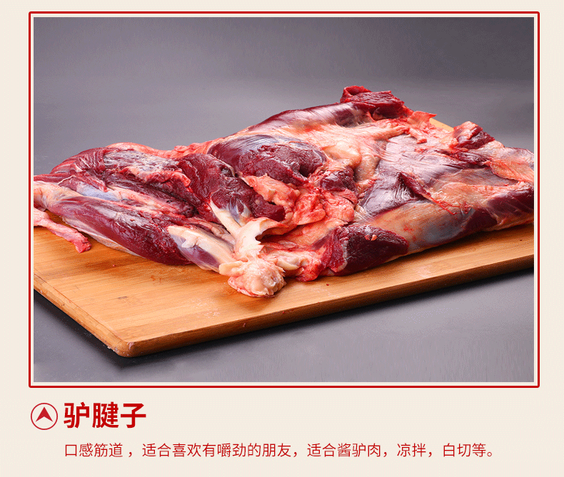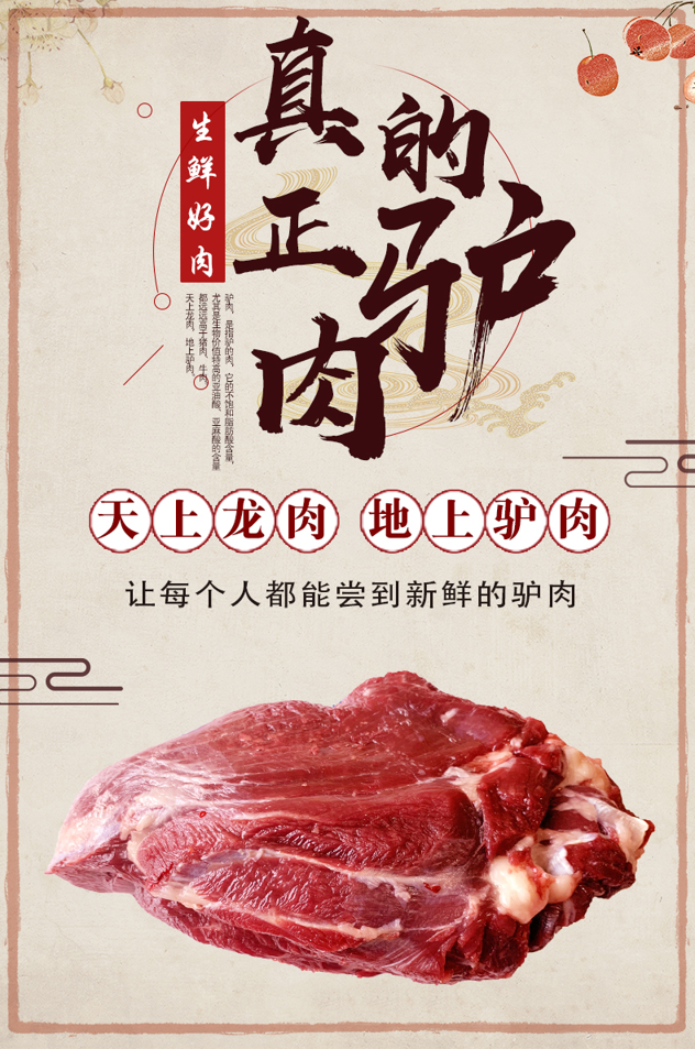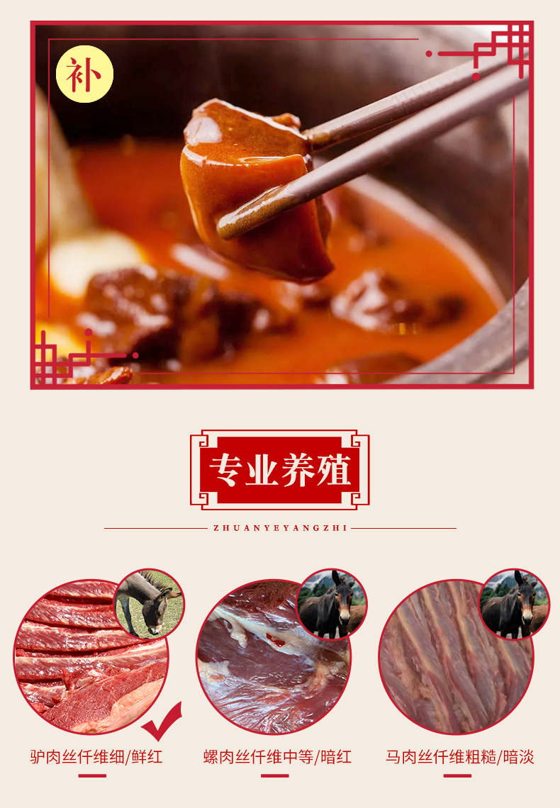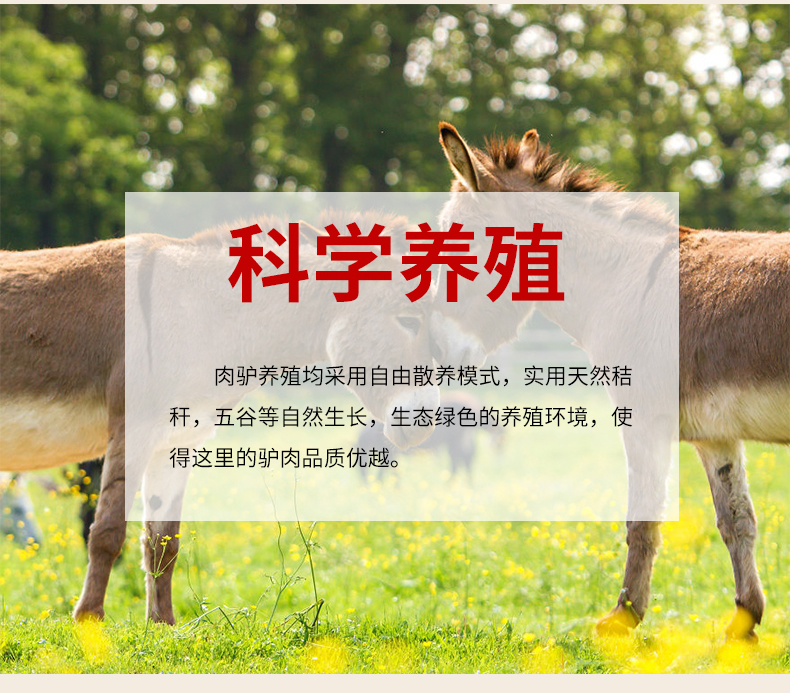 源自河北真正的散养驴肉,喂食秸秆、五谷等,生态绿色环境养殖,,驴肉肉质细腻,味道鲜美,老少老少皆宜。
