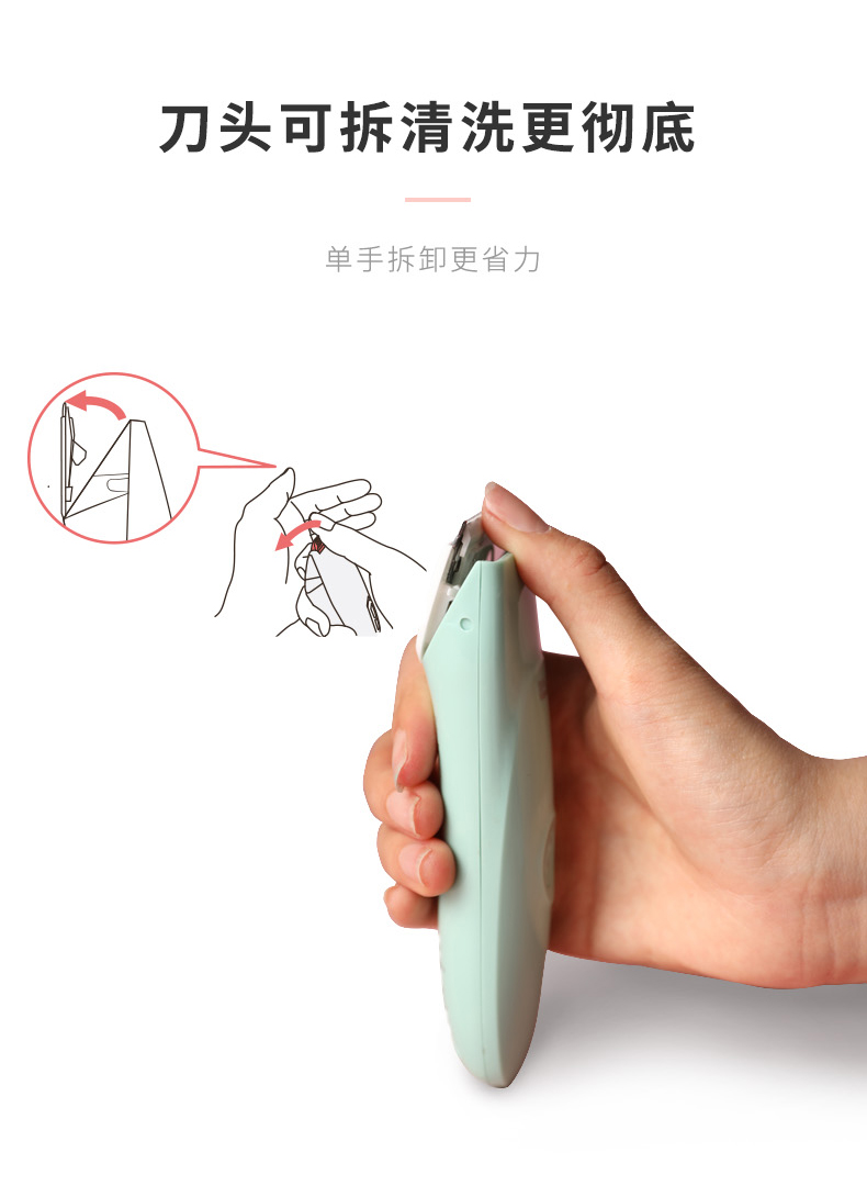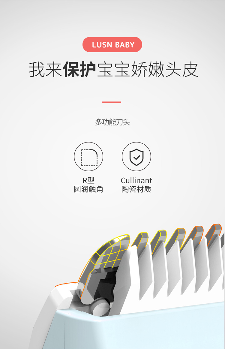 在安全方面,刀头为R型圆润触角的陶瓷材质,并且相比于市面上常见的20齿较宽的缝隙,这款更为细密的28齿设计,更适合幼儿柔细的发质,不会出现卡机卡发的情况,避免划伤或拽疼小朋友。