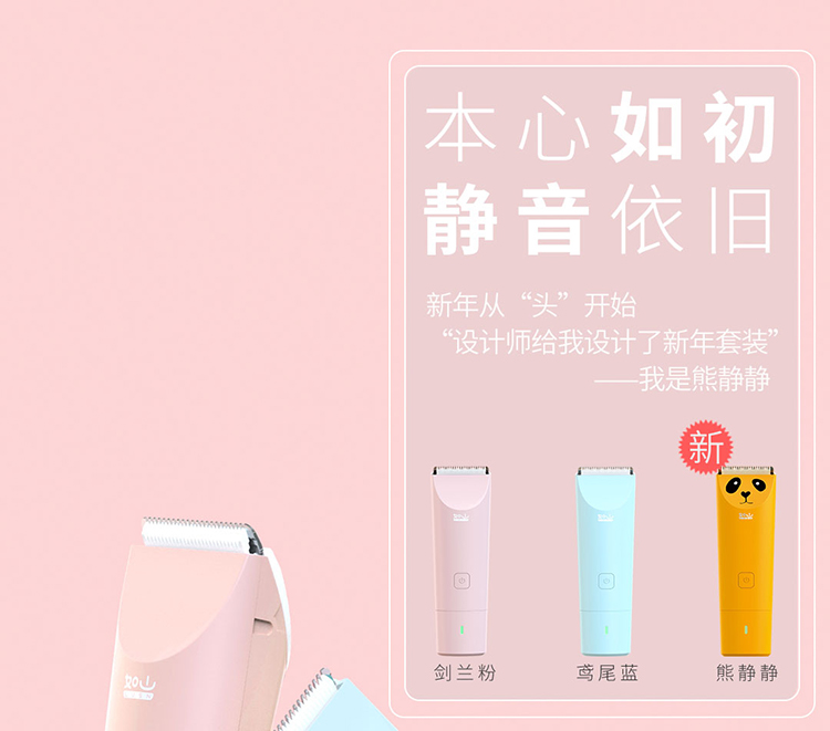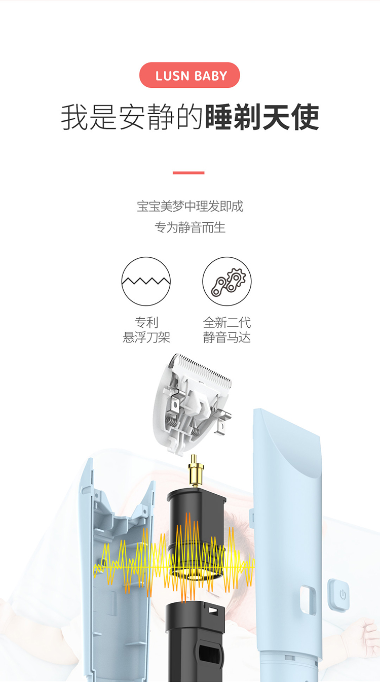 这款理发器采用精钢刀片与陶瓷刀头,内置专利悬浮刀架与全新二代静音马达,采用潜艇发动机减震技术,有效减少震动噪声传导,声音小于55分贝,即便是小朋友睡着,也能轻松理发。