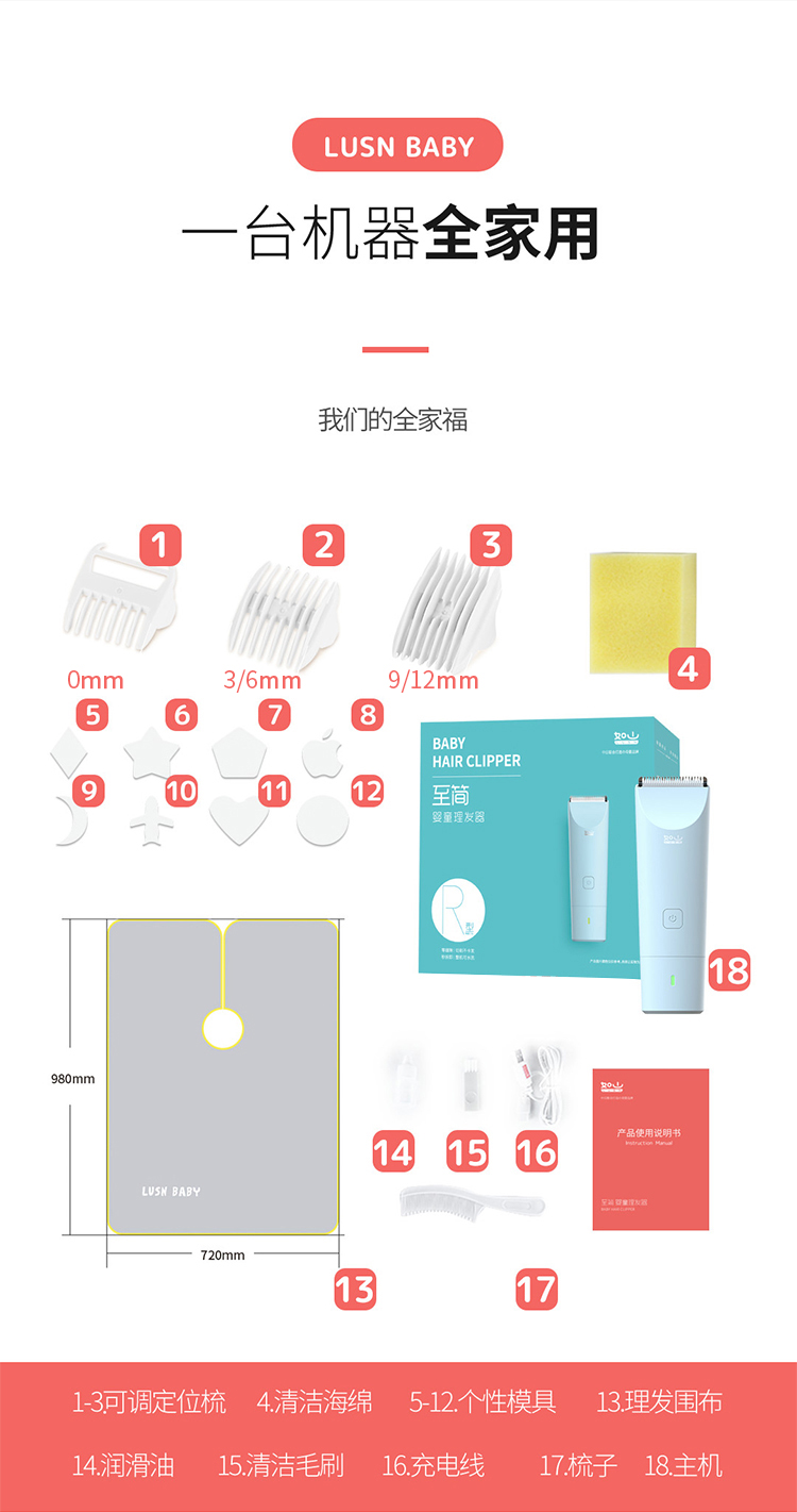 理发器采用IPX7级防水技术,全身可水洗,清理方便。理发器配件丰富,不仅小朋友可用,全家人都能使用理发,更为实用方便。