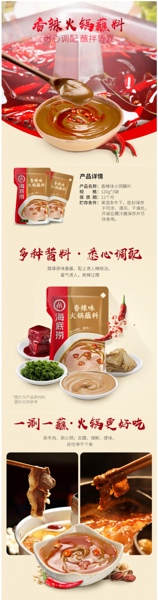 天猫荷蕊食品专营店26.87元,可领10元优惠券,实付16.87元到手,共120g*3包,近期新货。海底捞火锅的香辣味蘸料,是芝麻酱、花生酱、韭花酱的混合酱料,味道醇厚,去膻、增鲜、提味。