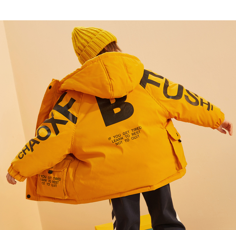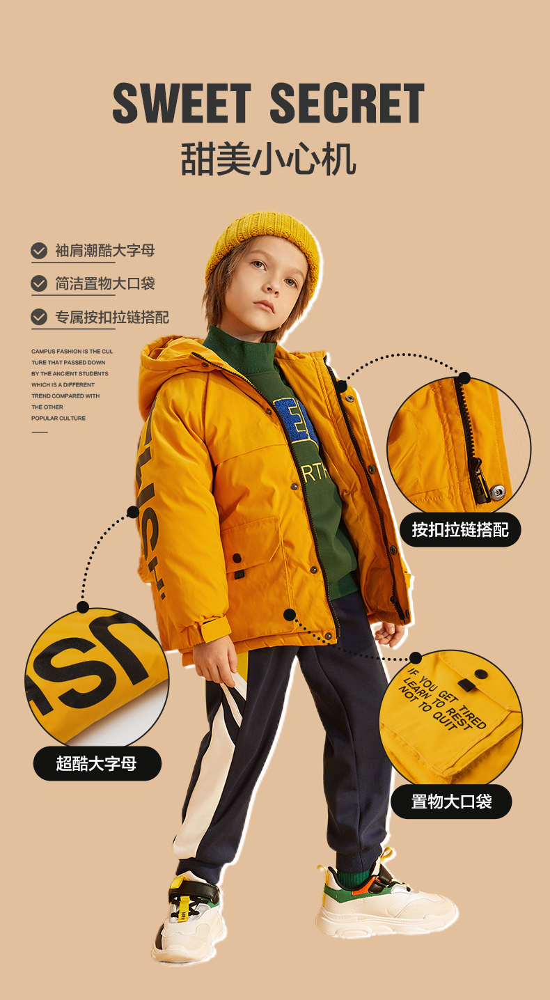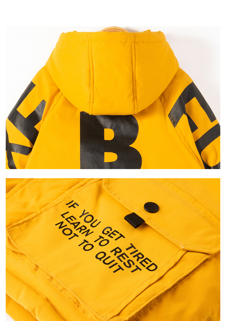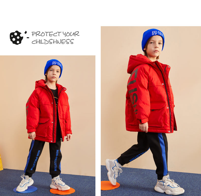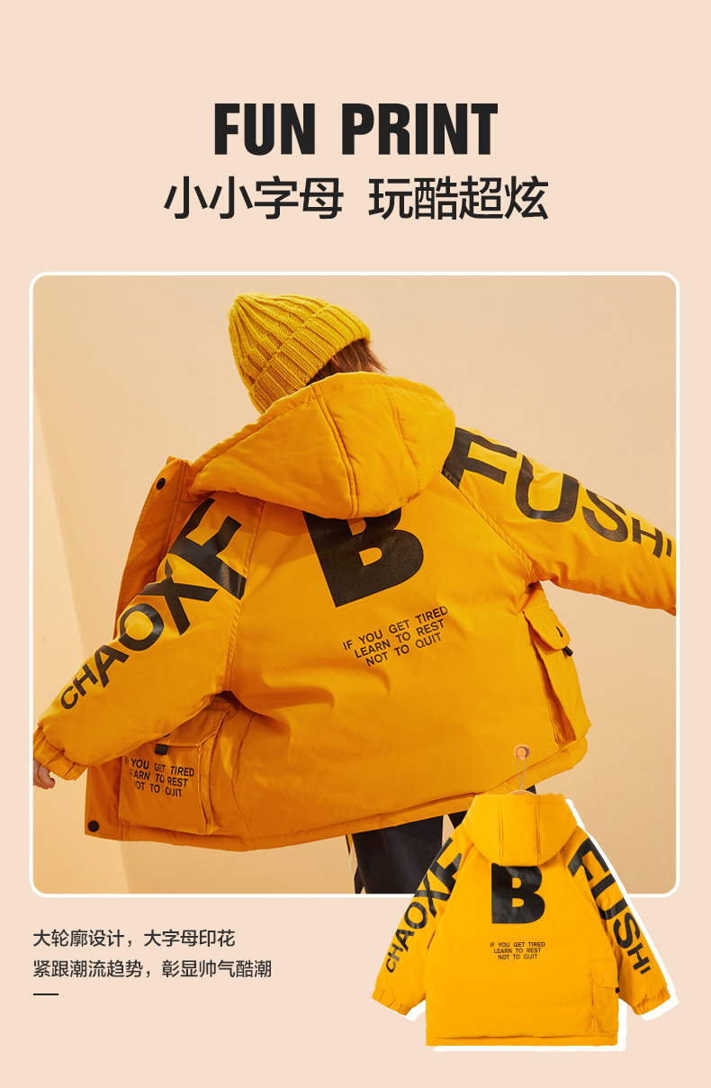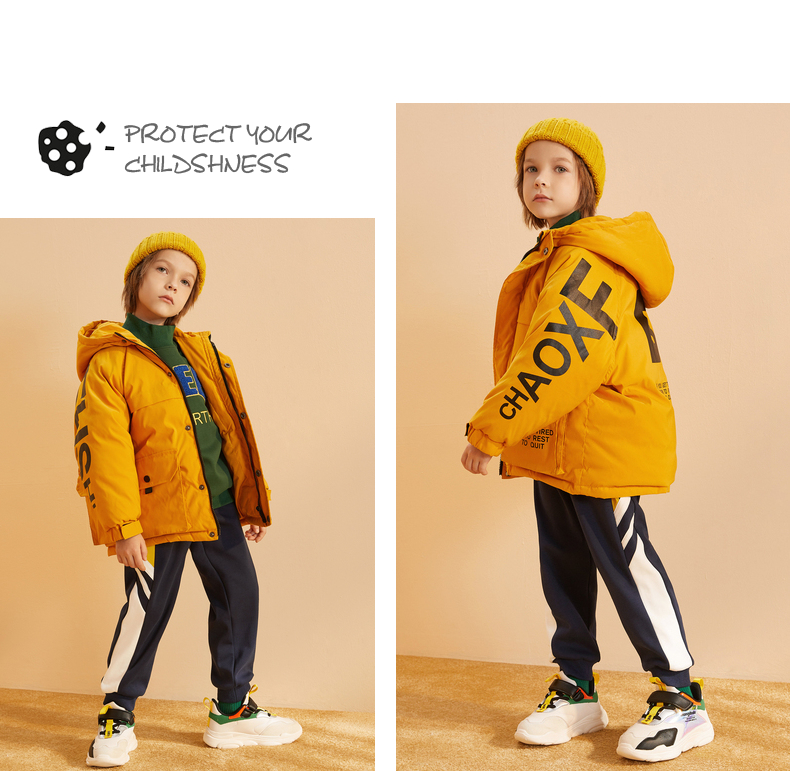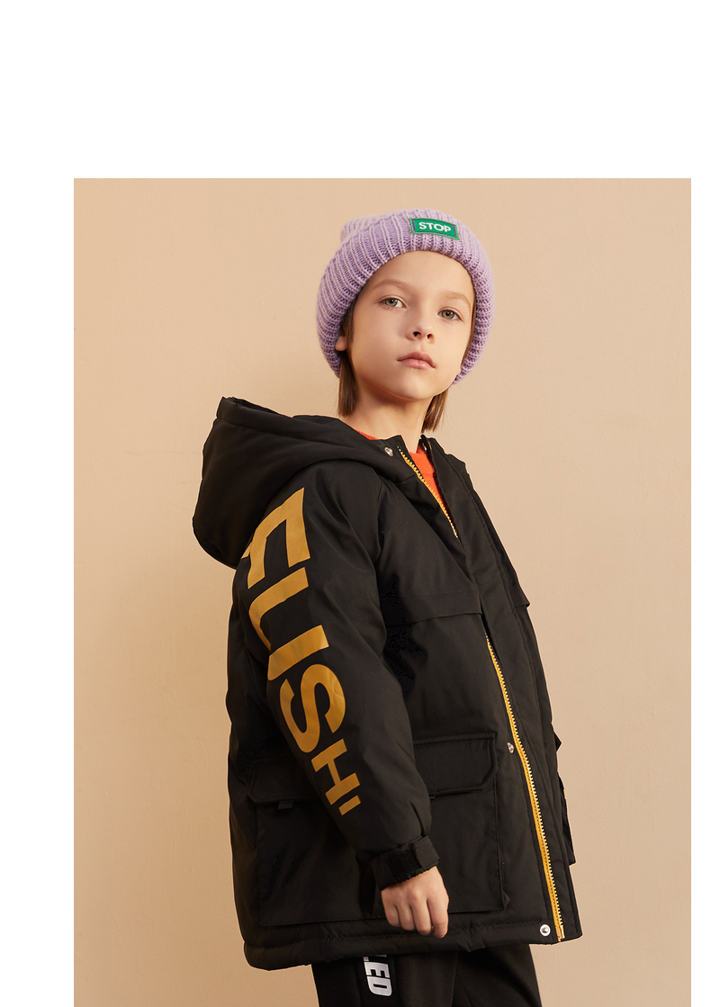 宽松合体版型,基本不挑身材;双重门禁设计,搭配松紧袖口不易灌风,保暖效果更好。时尚连帽印花款式设计,适合小朋友穿着。