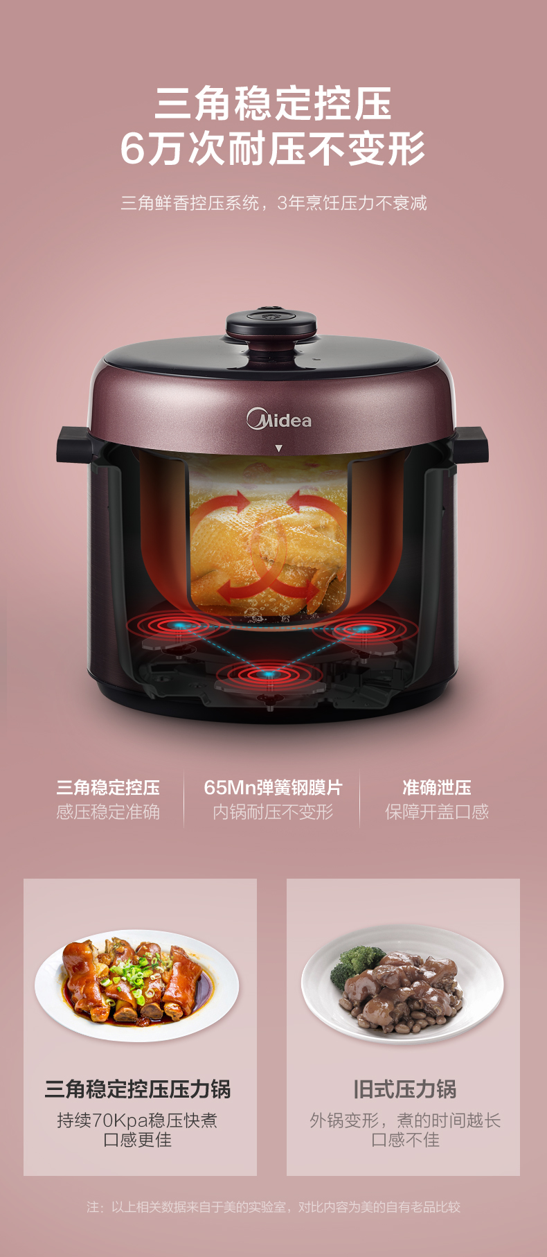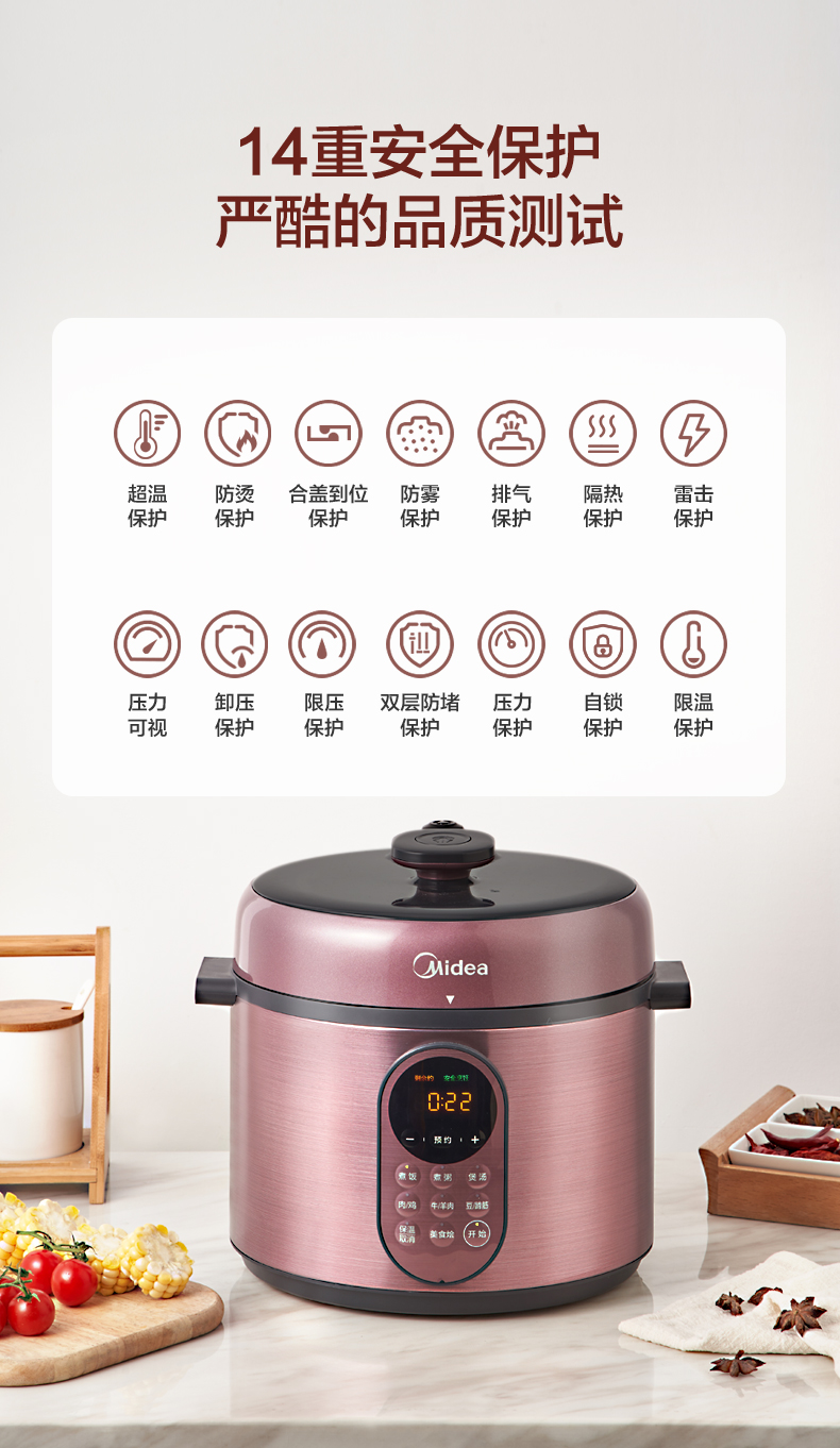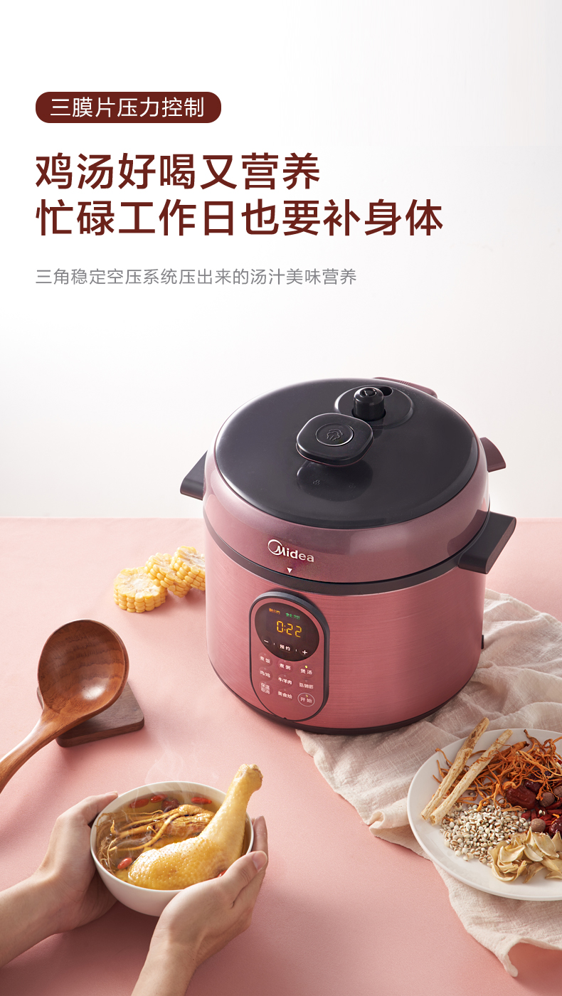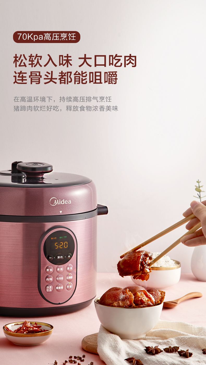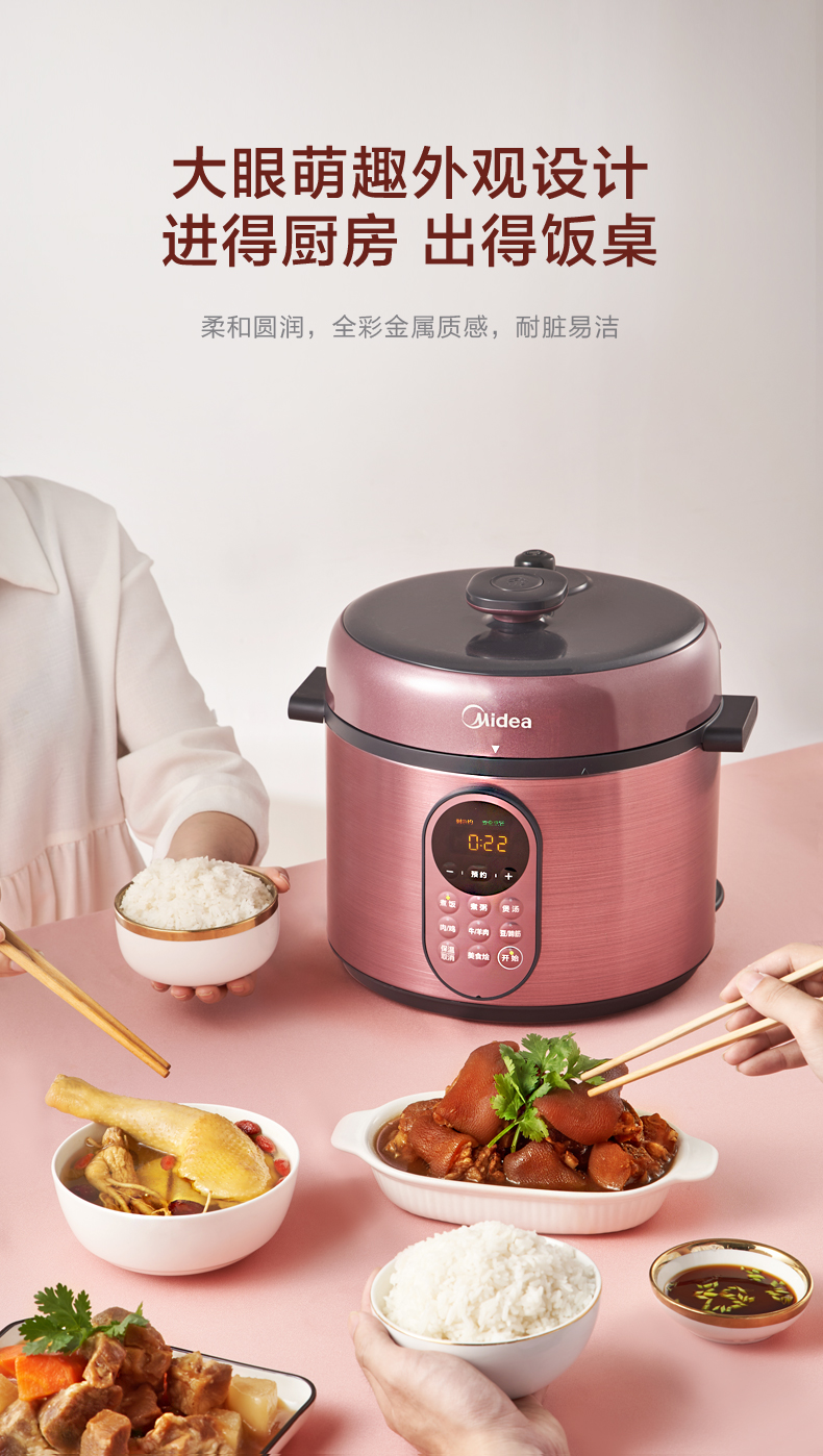 美的这款电压力锅,金属拉丝工艺,更加具有美感,很时尚。LED显示屏+实体按键设计,有8大常用菜单,煮饭、煮粥、煲汤、肉/鸡、牛羊肉、豆/制酱、美食烩;