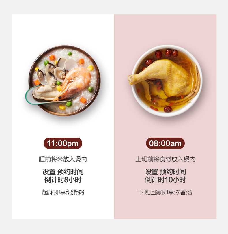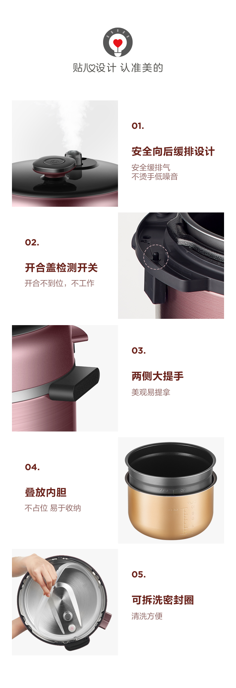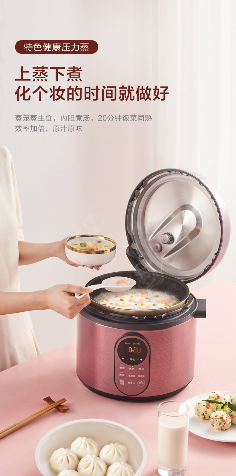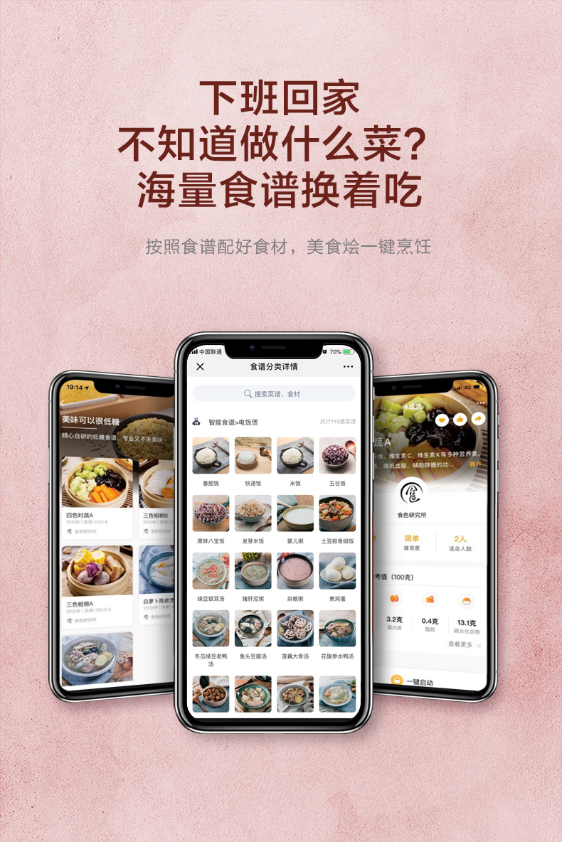 智能8段调压,10重安全防护,自动识别不同食材,释放不同压力进行蒸煮,锁住食材的美味;还有进度显示,烹饪过程,一目了然,还有开盖收汁和一键排气功能;