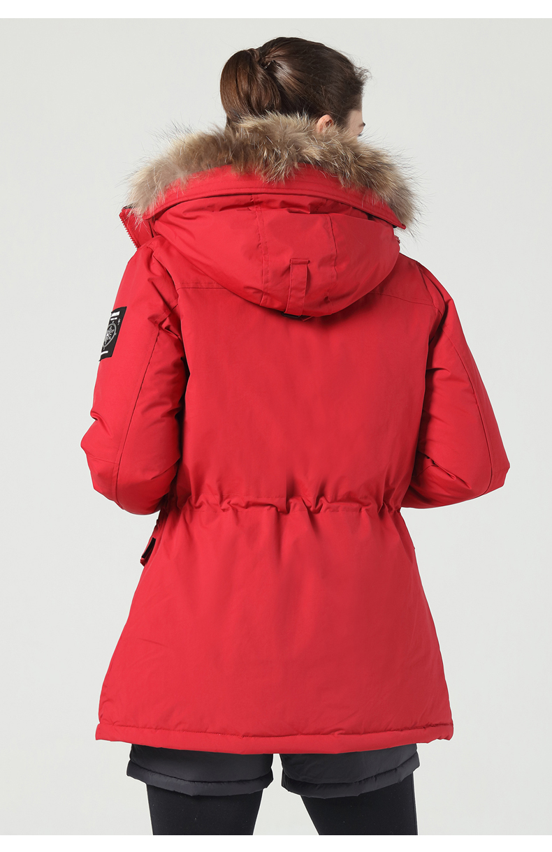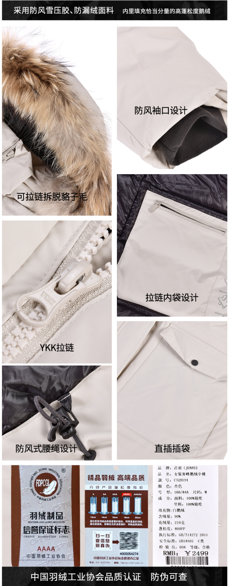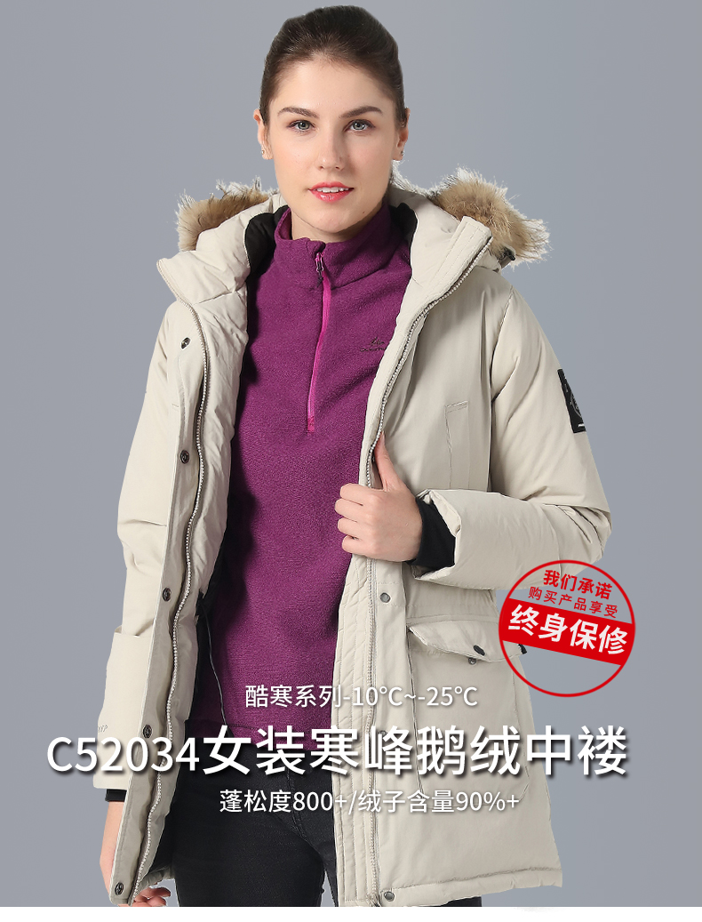 这款君羽寒峰女中长款女士羽绒服,属于酷寒款,可抗-15℃~-30℃,内里填充了800蓬90%鹅绒,M码充绒量210克,属于加厚厚度,防风防雪耐磨压胶防绒面料。直筒收腰设计,长度正好过臀。