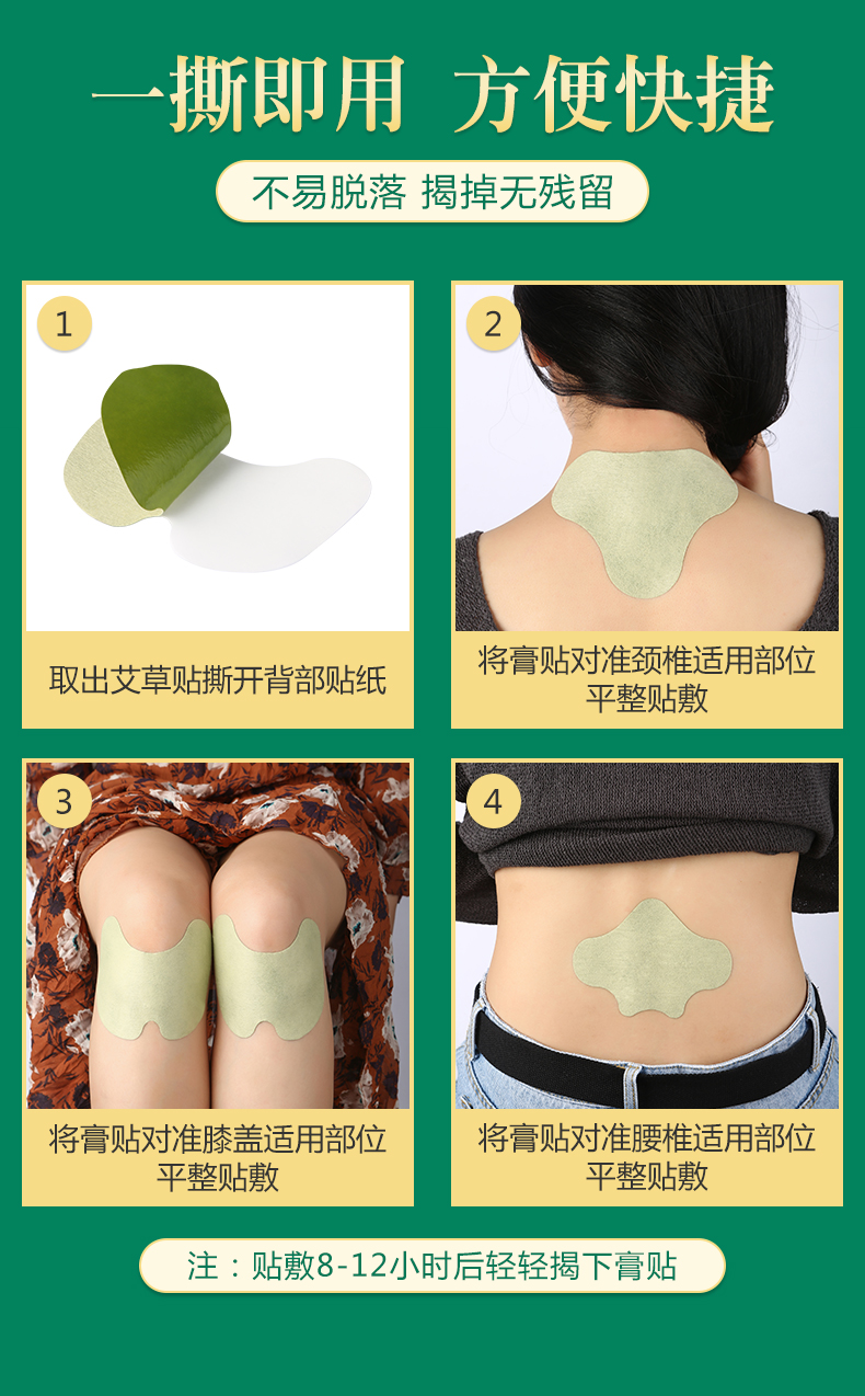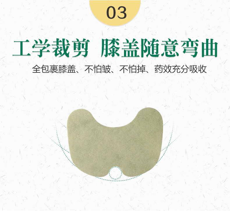 有膝盖贴、颈肩贴和腰椎贴可选,快贴艾叶贴,有效缓解疼痛。选用8种天然草本原材料制作,蝶型曲线设计的膝盖贴,贴得牢,不易脱落,行动方便。有效发热驱疼痛。