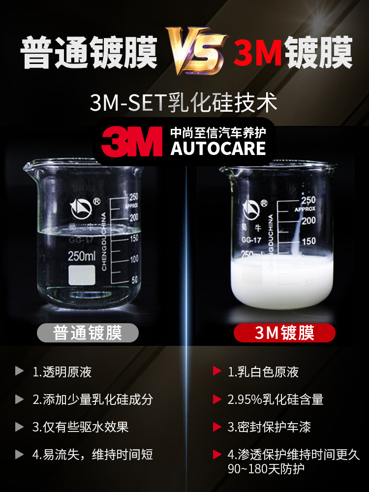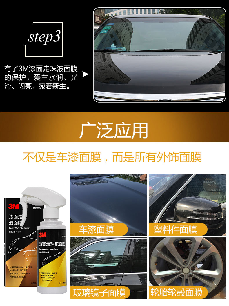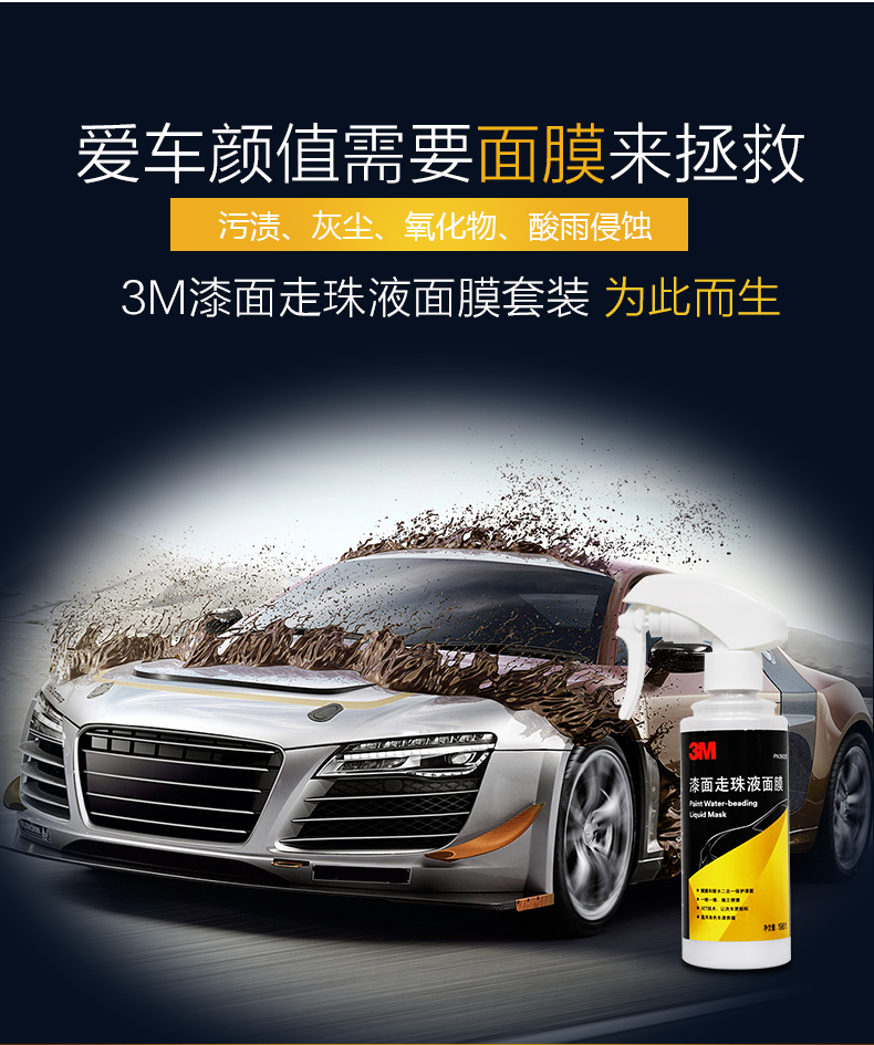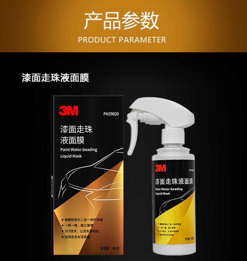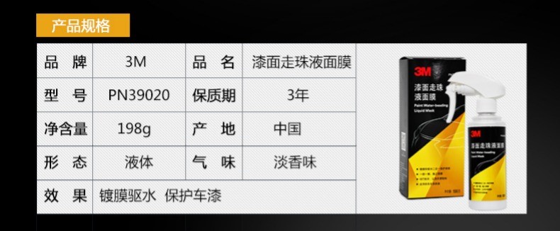 这款3M 漆面液体镀膜蜡套装,三分钟快速镀膜,保护车体光亮如镜,水过无痕,防污耐脏,耐高温,抗紫外线,防止老化,可长期保护漆面,适合各色车漆表面。
