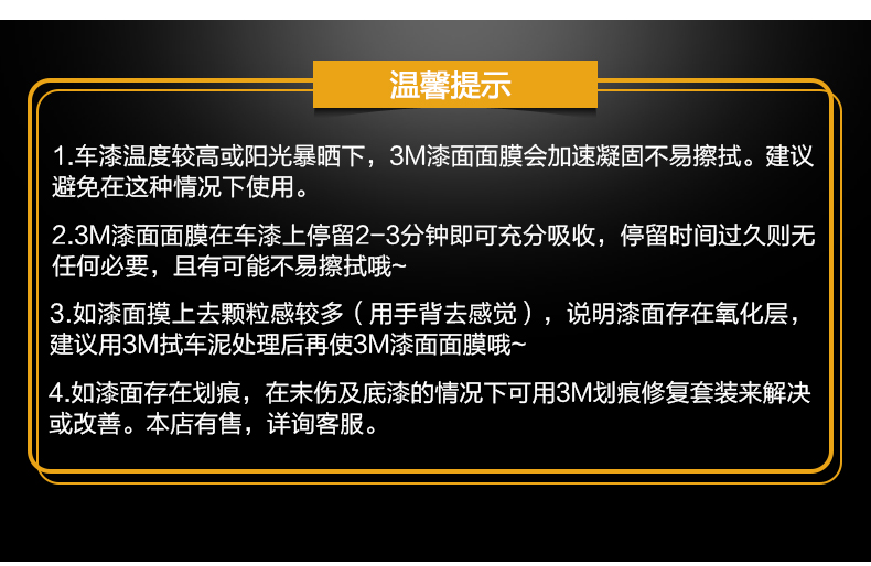 注:车漆液在较高温度和阳光爆晒下,会加速凝固,不易擦拭,建议避免在这种情况下使用。