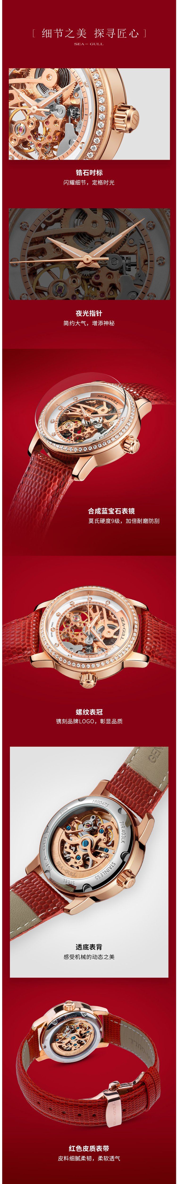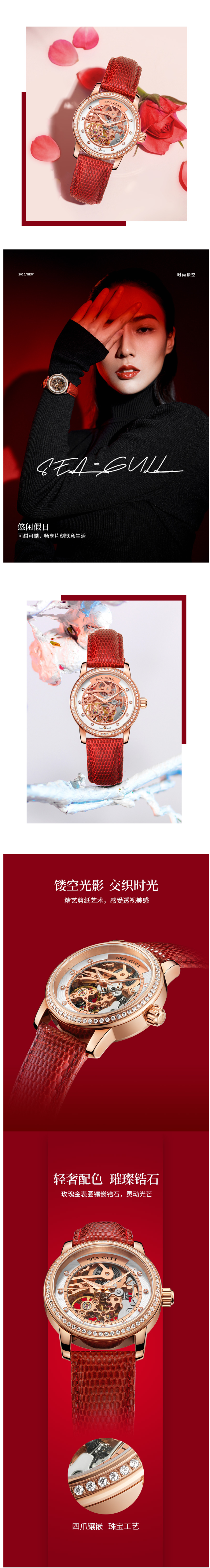 这款海鸥Seagull女镂空水钻全自动机械表,整体多层次镂空设计,玫瑰金表盘圈镶嵌锆石,灵动光芒。浪漫温婉宛若蕾丝般的表盘,搭配独立机械机芯,传递出兼具柔美与坚毅的力量。