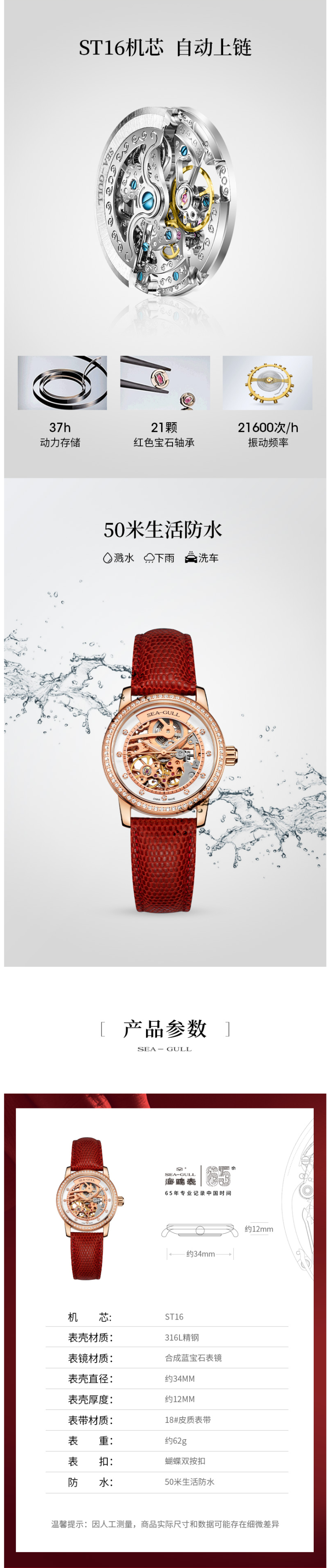 内置ST16缜密机芯、21颗红色宝石轴承,走时精准,37小时动能力存储,21600次/时摆频,自动上链,50m生活防水。