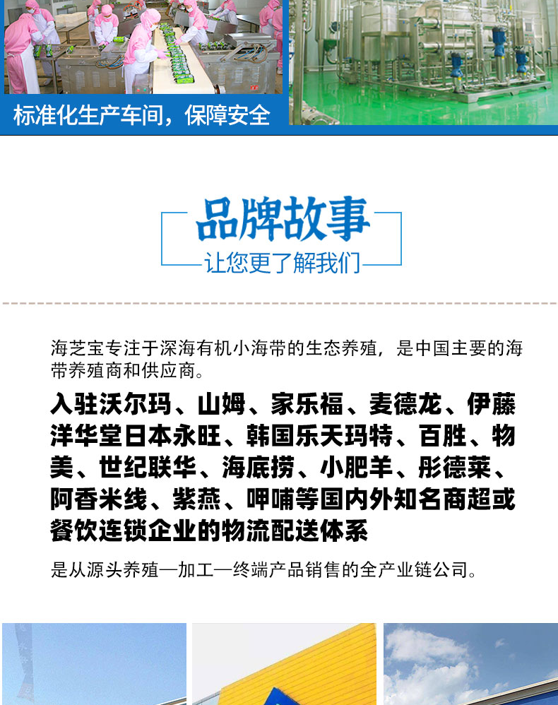 是山东海之宝海洋科技有限公司“品牌”,注册资金16000万,是中国500强企业---成山集团的控股子公司,拥有10万亩最纯净的深海养殖基地,及700余亩海带加工基地,现已开发“海芝宝”深海小海带原生态产品、海带面、即食休闲、鲜焙干品、礼品箱五大系列50余种特色产品。