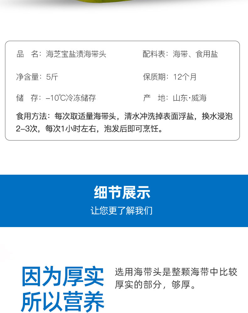这款海带头源自国家级海洋牧场,N37°向外8海里,40米深海,海域纯净无污染,海带头是海带比较厚实部分,腌渍保鲜,口感Q弹有嚼劲,拿来凉拌、煲汤都好喝!