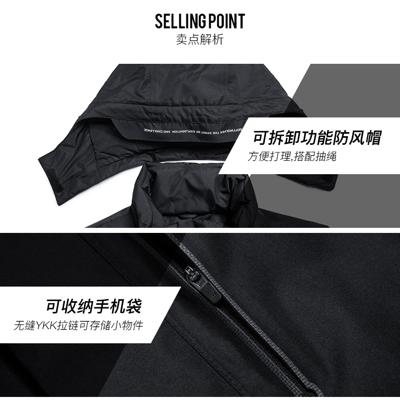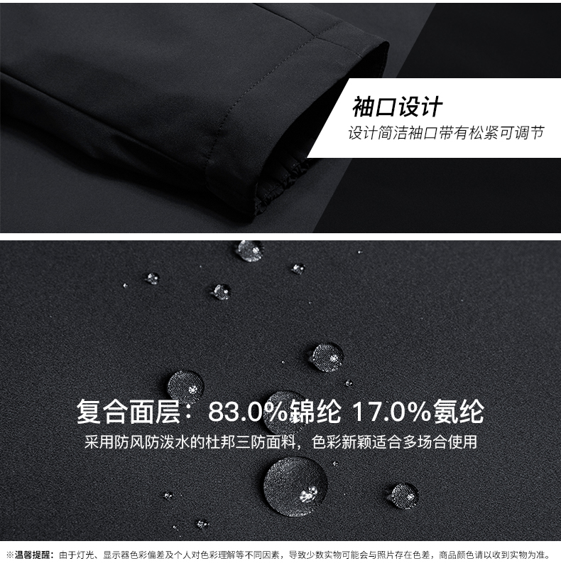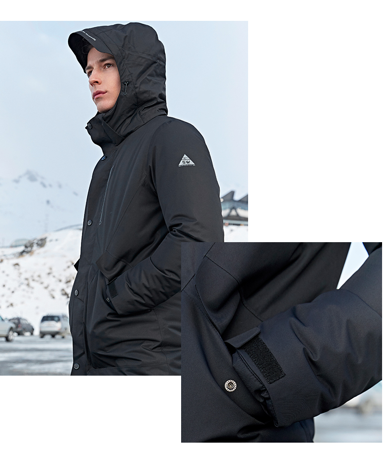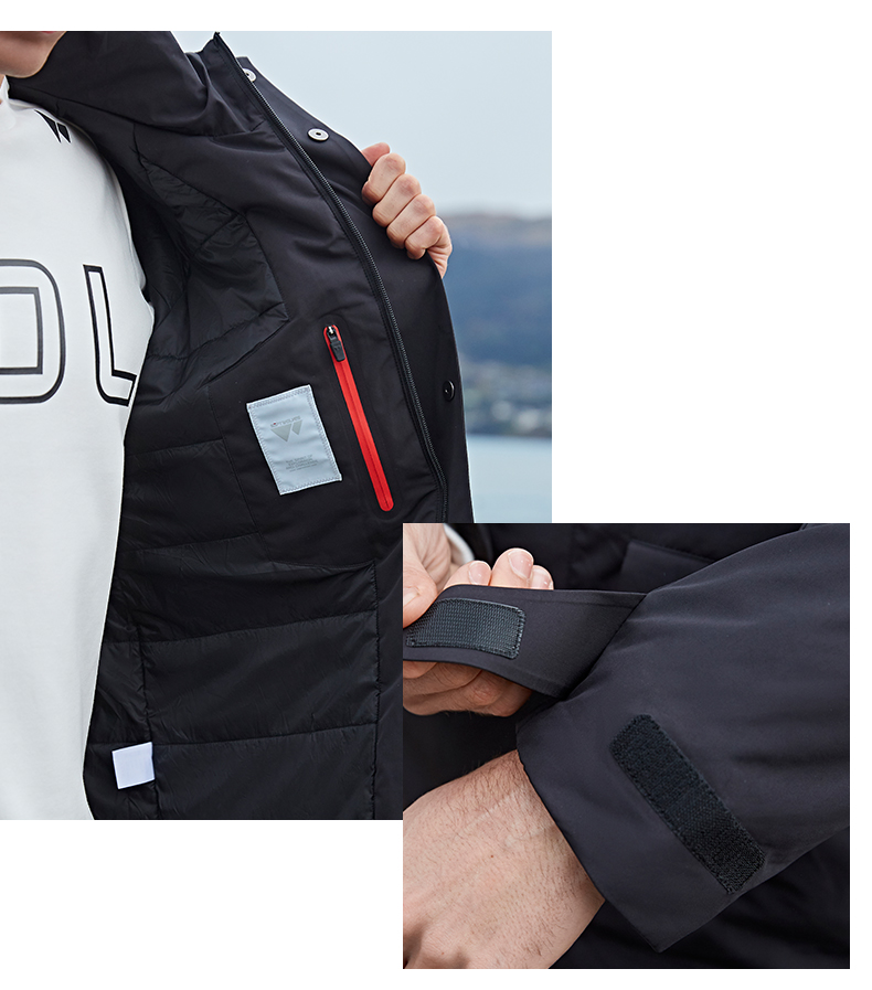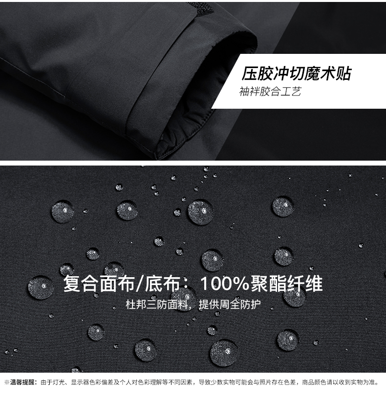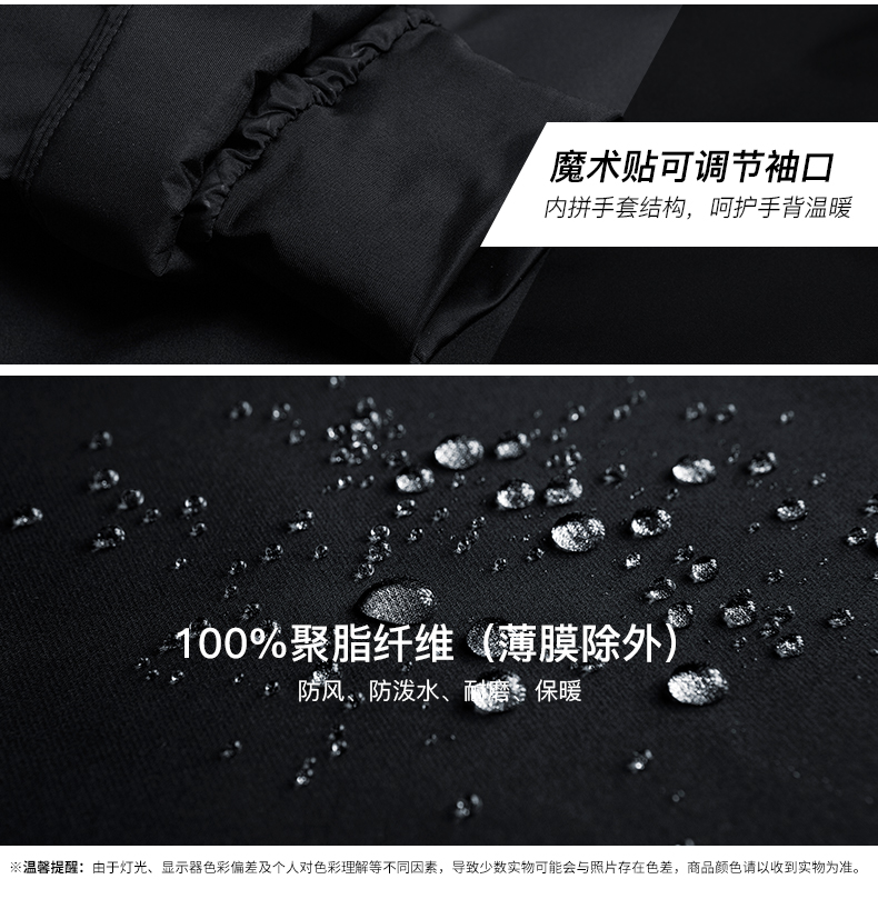 在细节上,袖口使用细腻弹力面料拼接而成,是可以套住半个手掌的拇指扣,能无隙包裹腕部,收紧防风,提升了保温性能,相比于单纯使用魔术贴的设计,舒适度更好,但是相对的成本也更高。外层则是模式贴袖口,冷时可贴紧保暖。