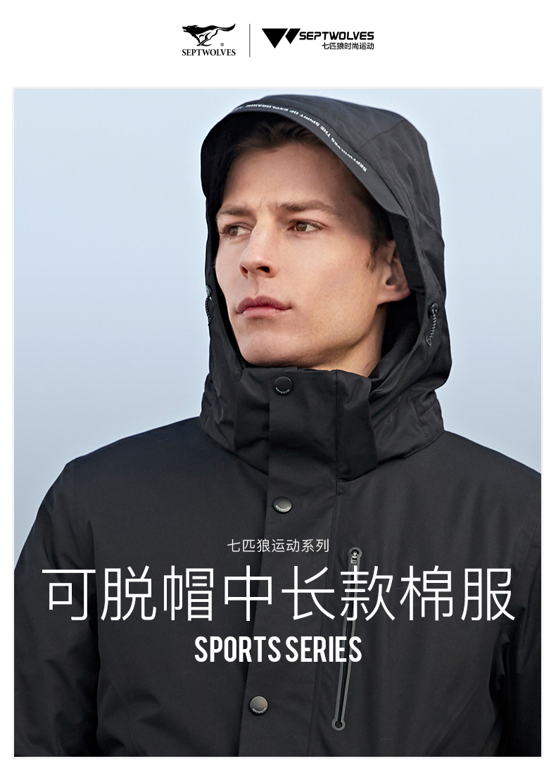 天猫七匹狼运动旗舰店619元,可领250元优惠券,实付369元到手,是正价1199元的3.1折,有短款连帽、短款可脱帽、立领中长款、可脱帽中长款可选,全都同价。