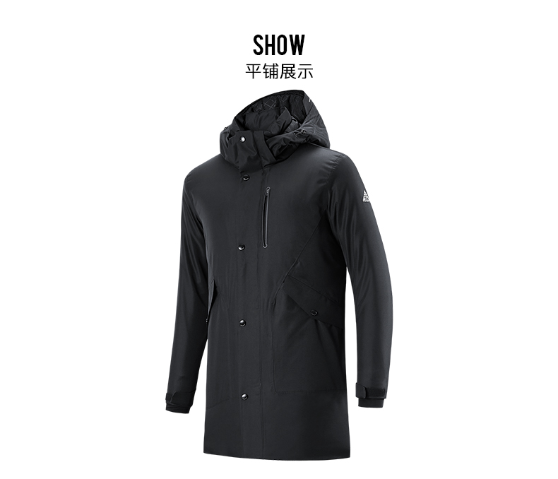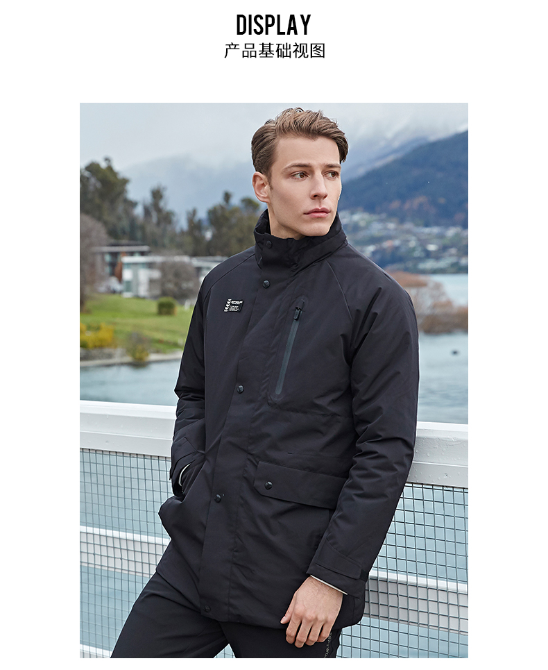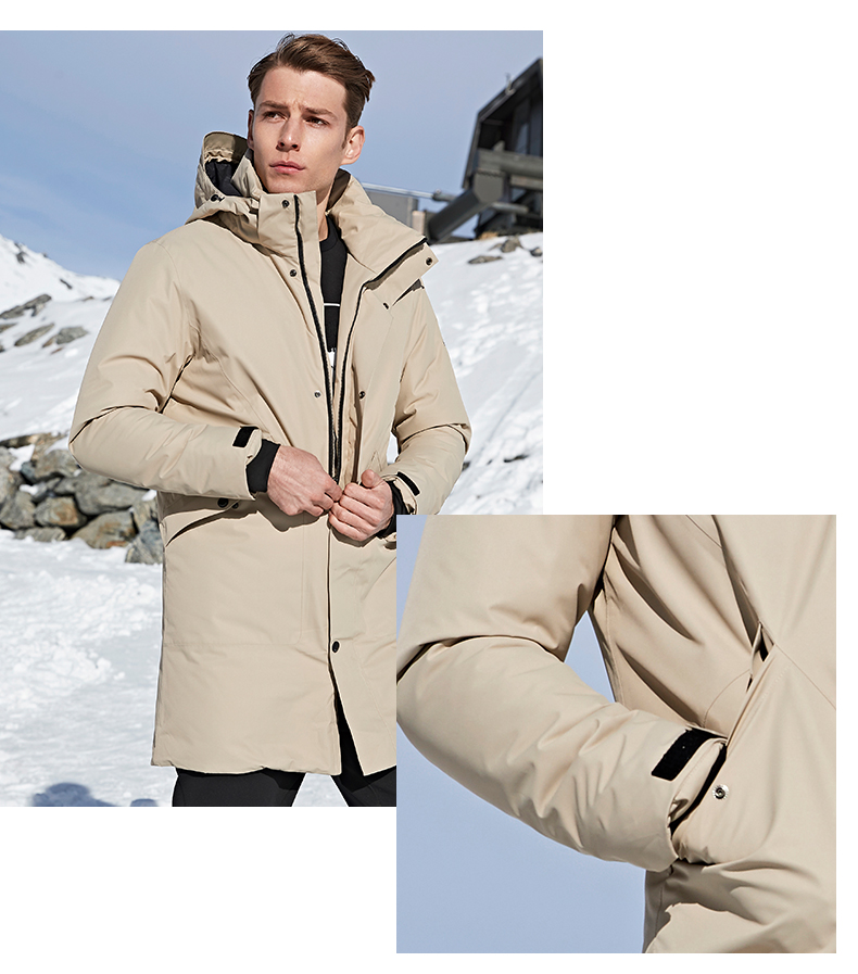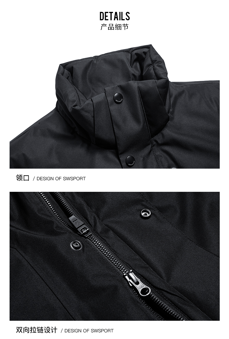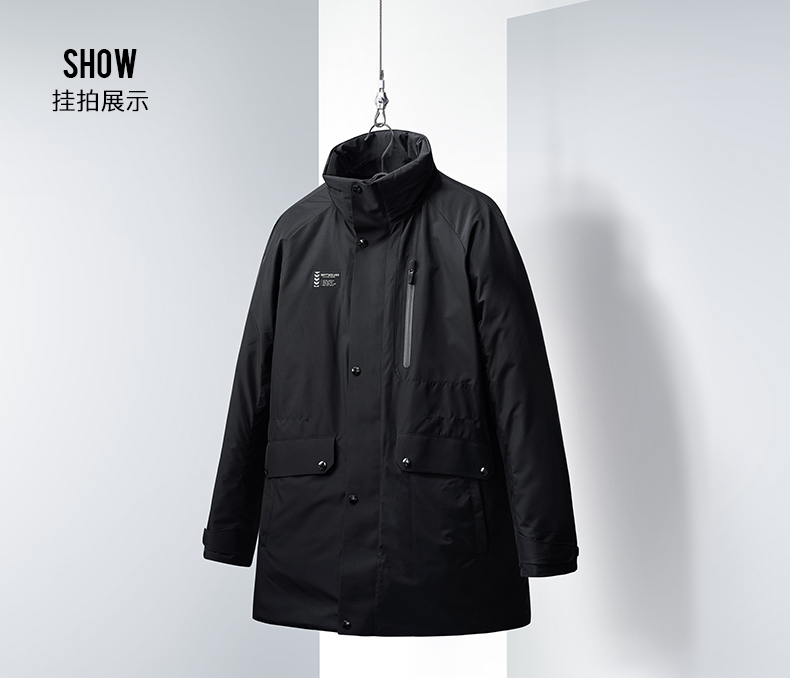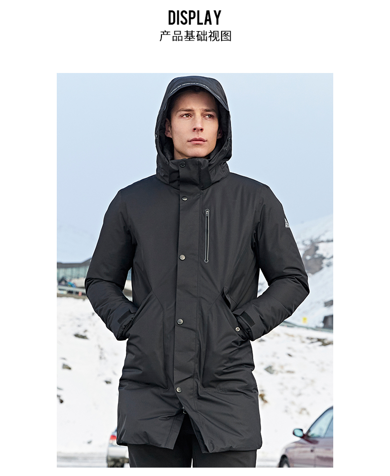 在款式,中长款式设计,下摆超过臀部接近大腿,上身显高显瘦。3D立体剪裁+合身版型,上身更得体不臃肿。半高领搭配防风帽设计,有调节抽绳,可以把脖子整个围住。帽子不需要时,也可拆卸了。
