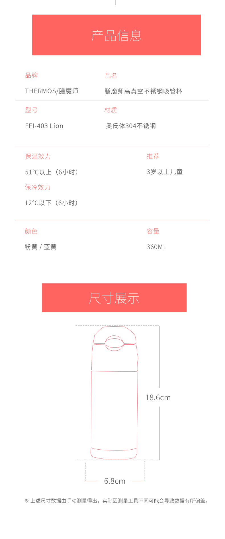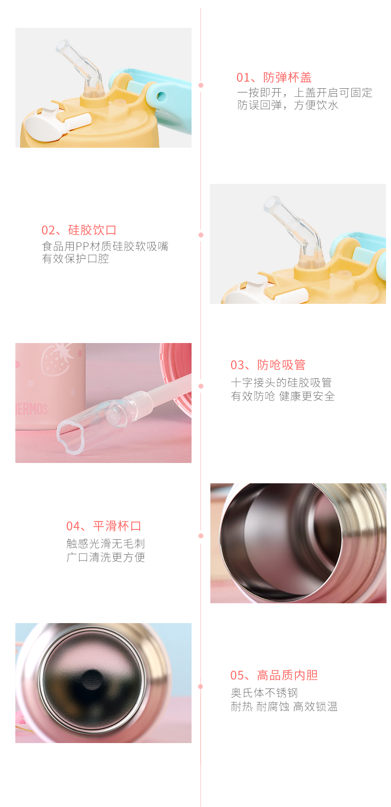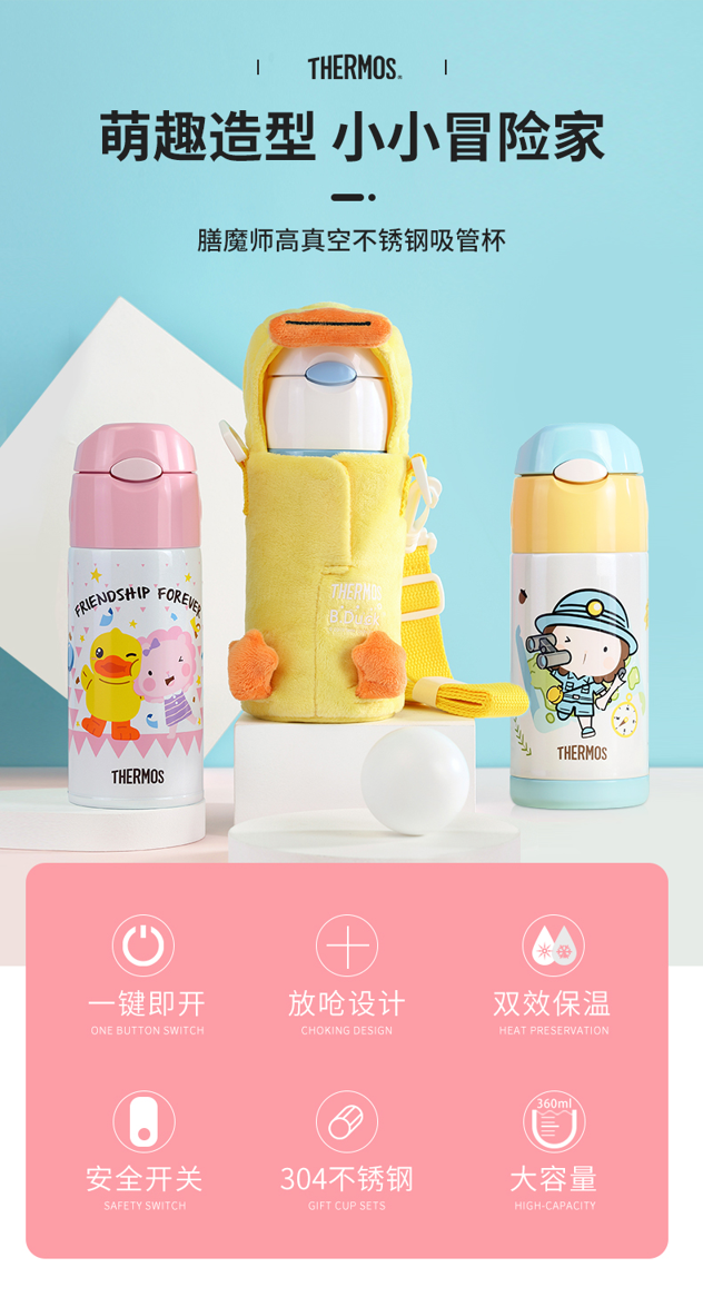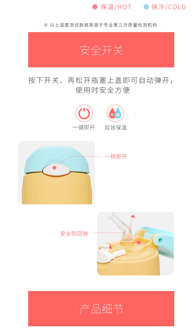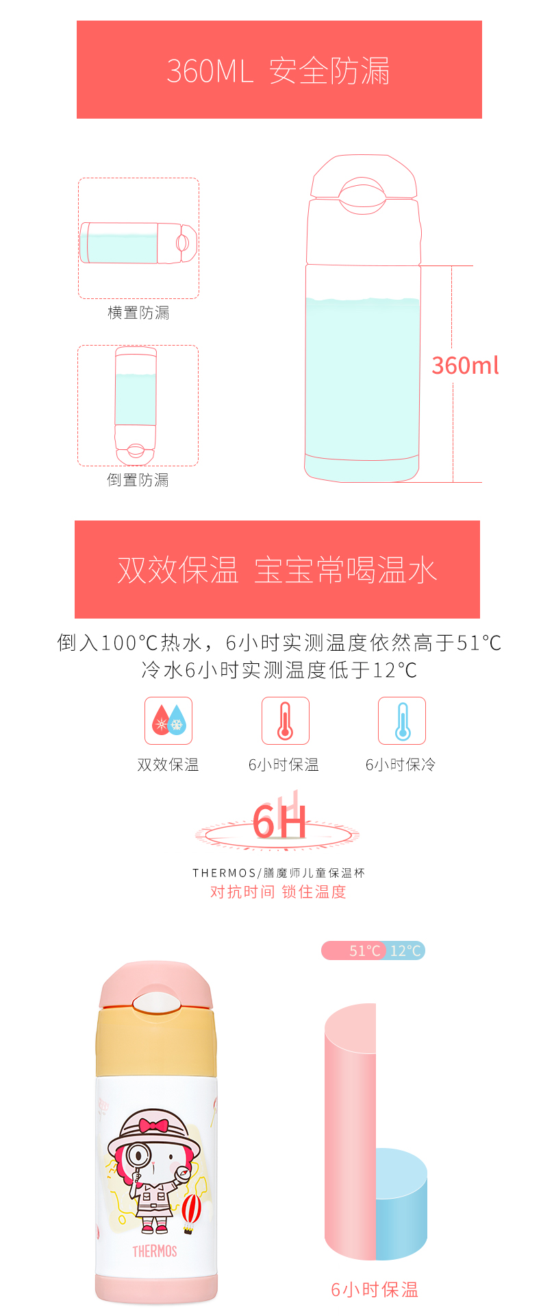 这款儿童保温杯,容量为360ml,双效保温,保温也保冷,倒入100度热水,6小时实测温度仍然高于51度,冷水6小时实测温度仍然低于12度。细节上,一按即开防弹瓶盖,方便饮水,食品用PP材质硅胶软嘴,十字接头防呛水,平滑杯口,安全可靠。