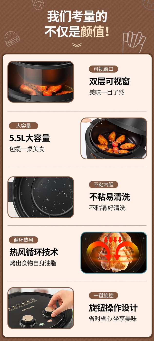 九阳新款发布的这款,5.5L的容量,比普通的2L,3L要大一倍,可轻松烤整鸡,采用双层可视窗,可监控食物的状态,更好掌握火候。智能定时控温,轻松一键旋钮操作,老人孩子上手也简单。具备开盖自动断电的保护功能,安全性高。