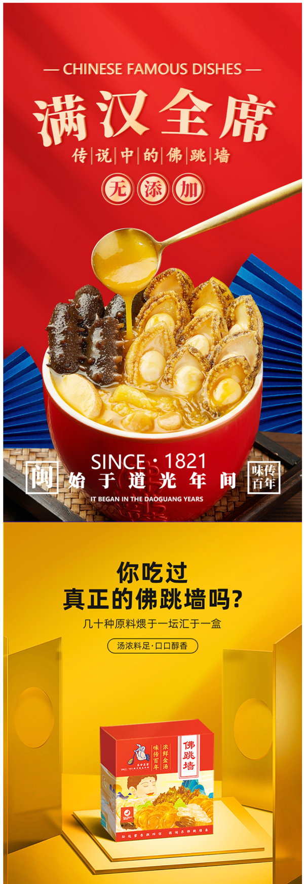 这款金汤佛跳墙,包含:海参、鲍鱼、花胶、灵芝蹄筋、翅丝、黄金鮑、鱿鱼皮肚、杏鲍菇等多种高端食材。高汤采用老母鸡、老鸭、金华火腿等原料,谨遵古法熬制,大火熬煮12小时、文火煲汤24小时,陈年花雕微火提香6小时,汤色金黄、富含胶质,香浓艳滑,味道醇厚。不含任何防腐剂成分。买回家加热即食即可,非常方便。