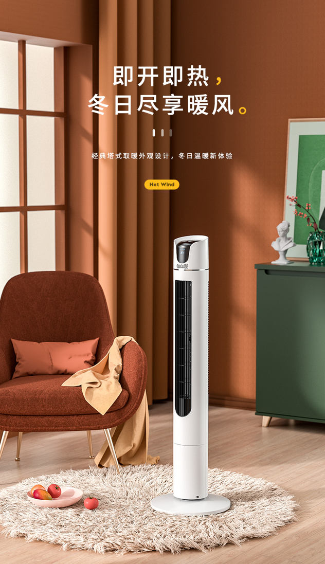 优质高效PTC陶瓷发热体,热效更高,安全性高,3重安全保护,倾倒断电、自动温控、过热保护,独有出风口设计,方便携带,迷你小巧,取暖小金刚,采用优质工程塑料,细密钢网结构防止烫伤,无光、无明火、无噪音、静音取暖。