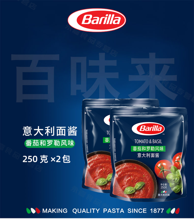 Barilla百味来是来自意大利的食品品牌,至今有着百年以上的历史,其拳头产品就是生产的意大利面类食品。这款番茄罗勒风味意大利面酱由美味番茄,芳香罗勒和各种精选当地食材混合制成,味道鲜爽芳香可搭配各类意面。