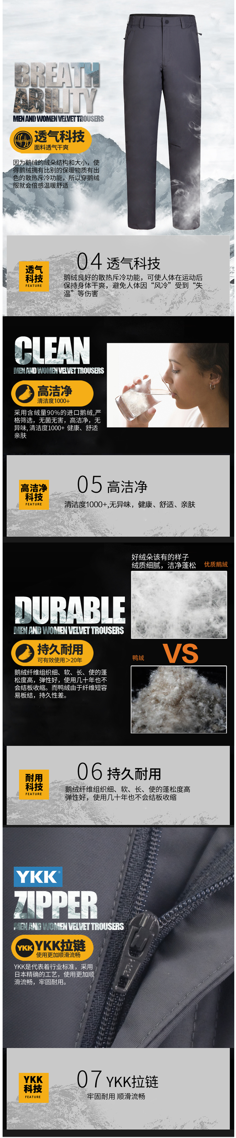 裤脚有防雪抽绳可收紧,插袋拉链是YKK的。总的看,这是一款性价非常高的羽绒裤,面料和保暖效果都很好,黑色万能百搭。