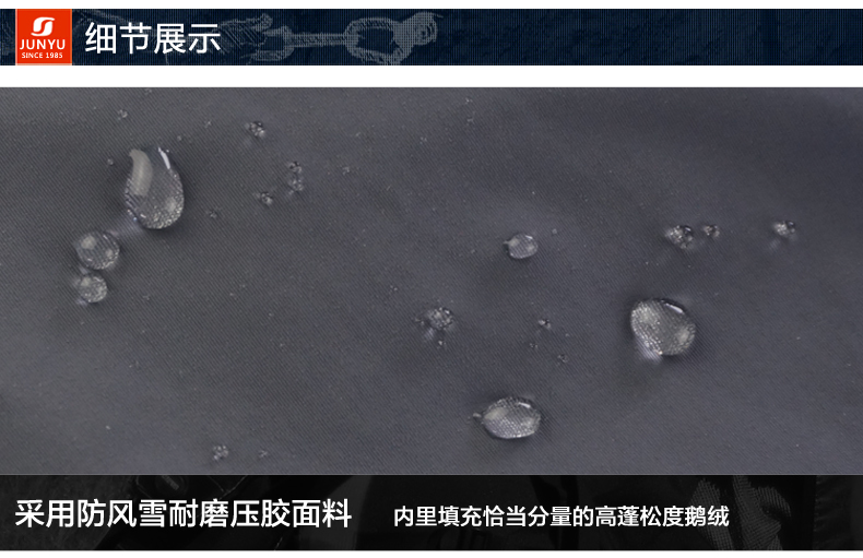 外层面料上,使用防风防雪耐磨压胶防绒面料,经过防水处理,阻止雨水渗入,能保持面料长期干爽、洁净。羽绒采用先车出羽绒隔舱后充绒的方式,缩绒针细针眼搭配粗线的防钻绒工艺。