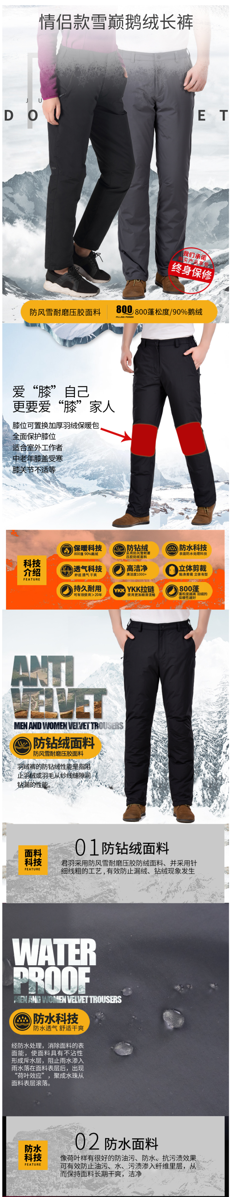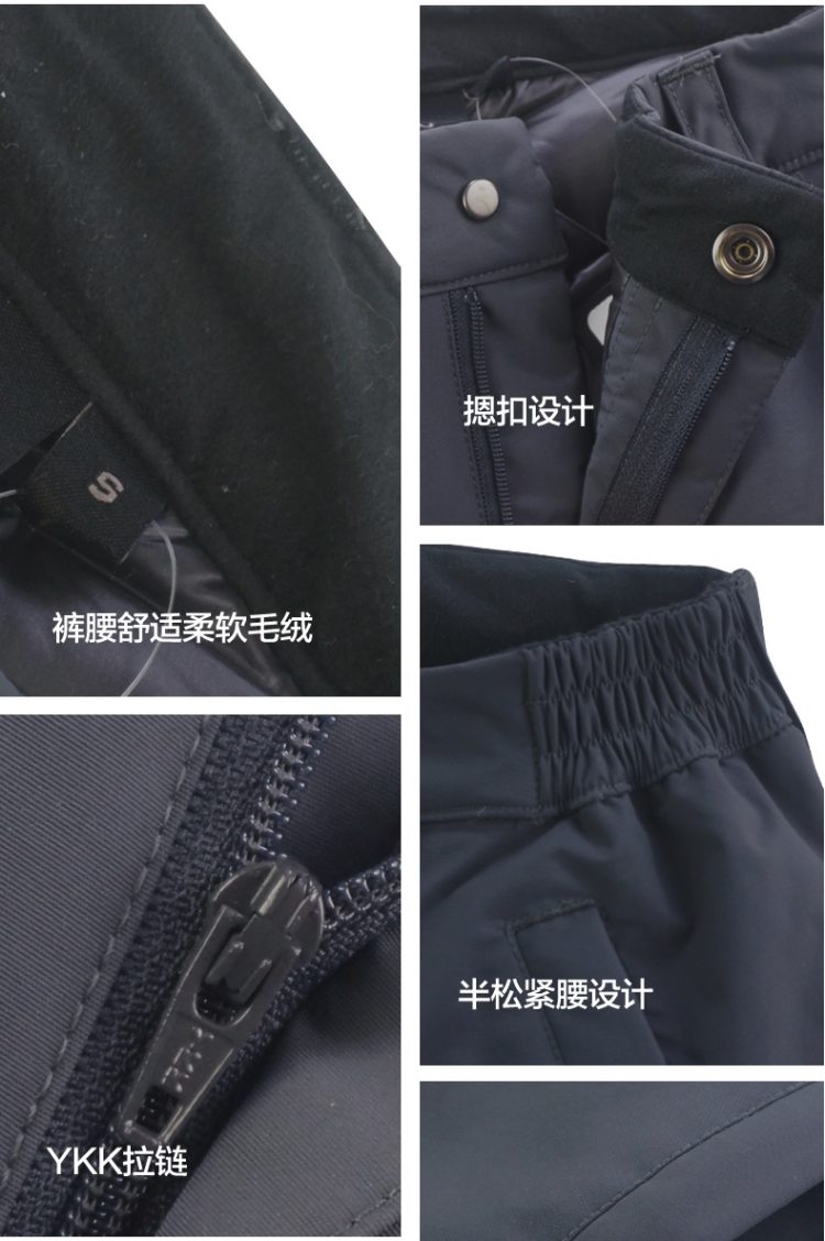 在款式和细节方面,标准版型,膝盖位置特别增加了可置换加厚羽绒的保暖包设计,全面保护膝盖部位,避免受寒;裤腰内有一层舒适柔软的毛绒,亲肤保暖无刺激,两侧是半松紧腰设计,可穿腰带,裤腰处的门襟是摁扣的;