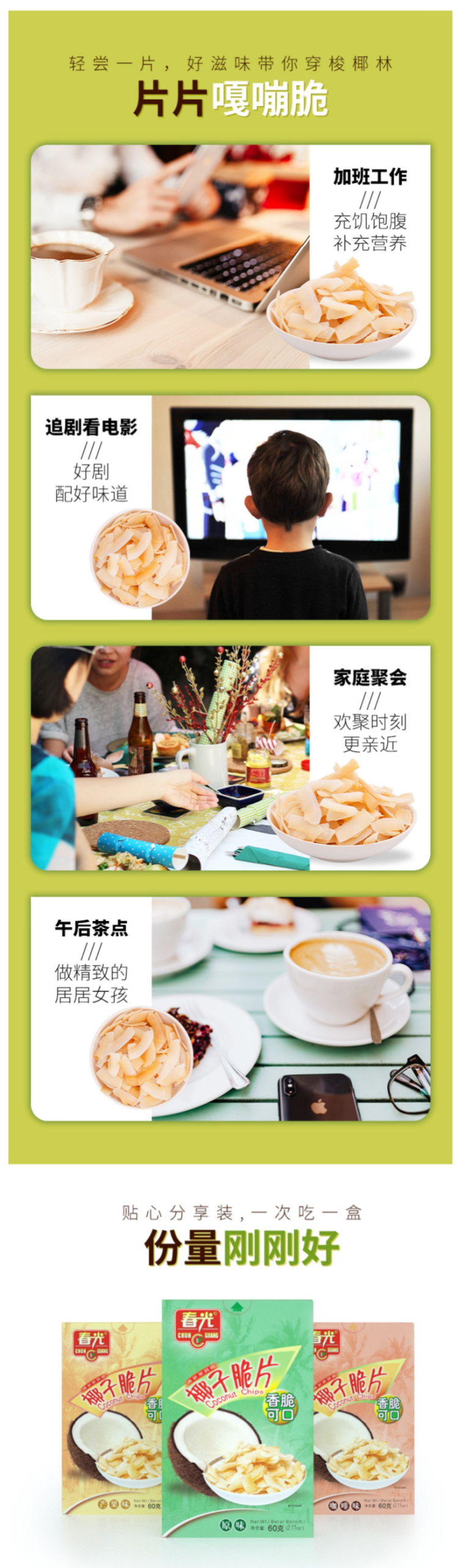 这款春光 烘烤椰子脆片,优选产自文昌东郊椰林的新鲜椰果为原料,经过适度烘烤而成,呈现短条状,色泽黄白自然,椰香四溢,轻薄香脆,入口片片嘎嘣脆,规格是60g*3袋。