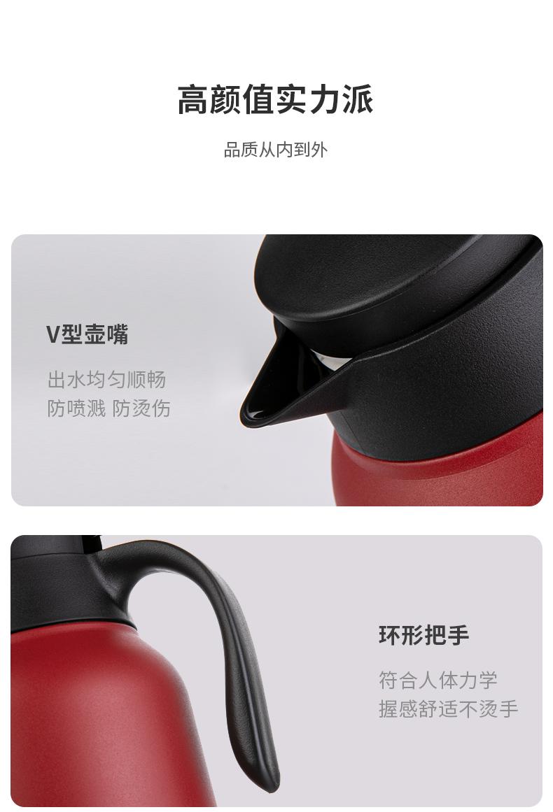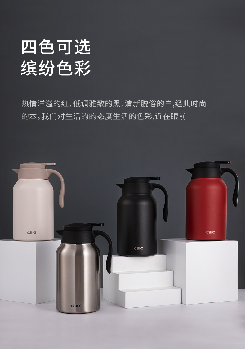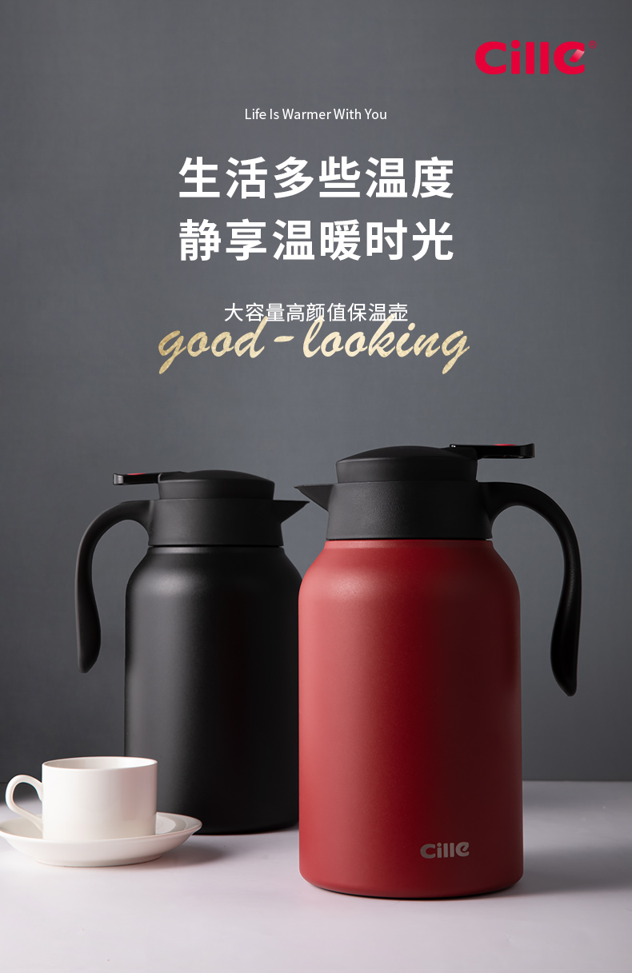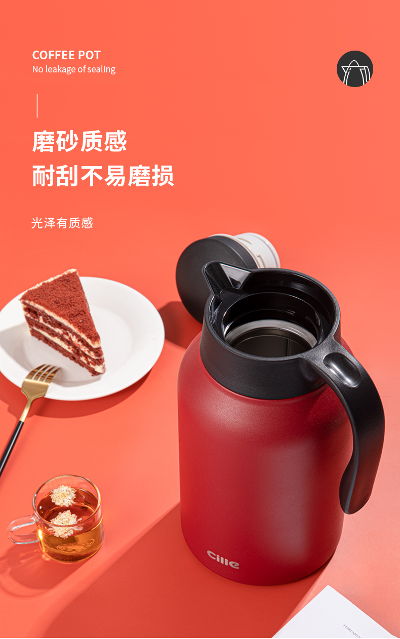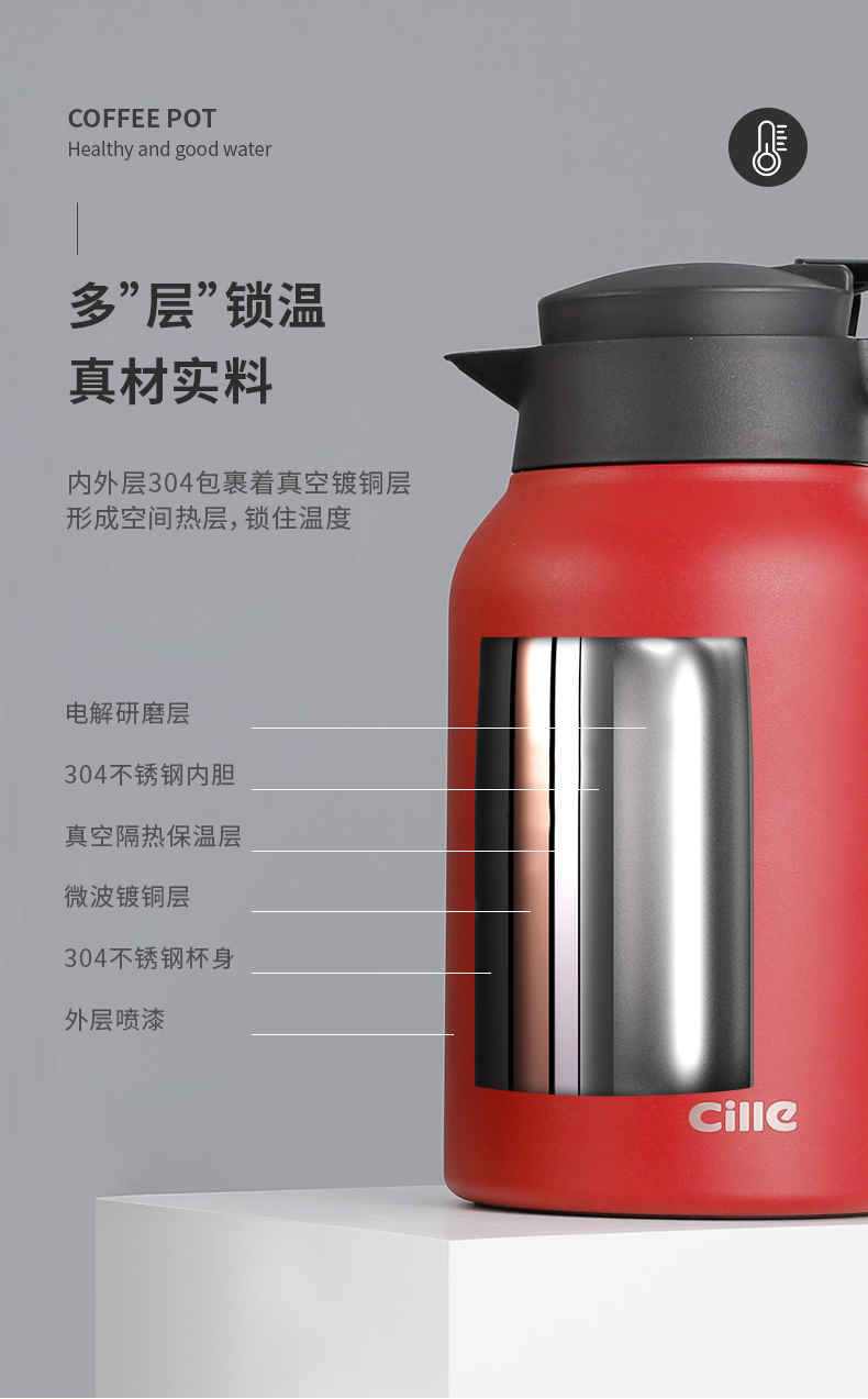 这款希乐 304不锈钢保温壶,食品级304不锈钢内胆,抗氧化、耐腐蚀、无异味。壶身是6层组合,外层喷漆、304不锈钢壶身、微波镀铜层、真空隔热保温层、304不锈钢内胆、电解研磨层,形成空间热层,锁住温度。