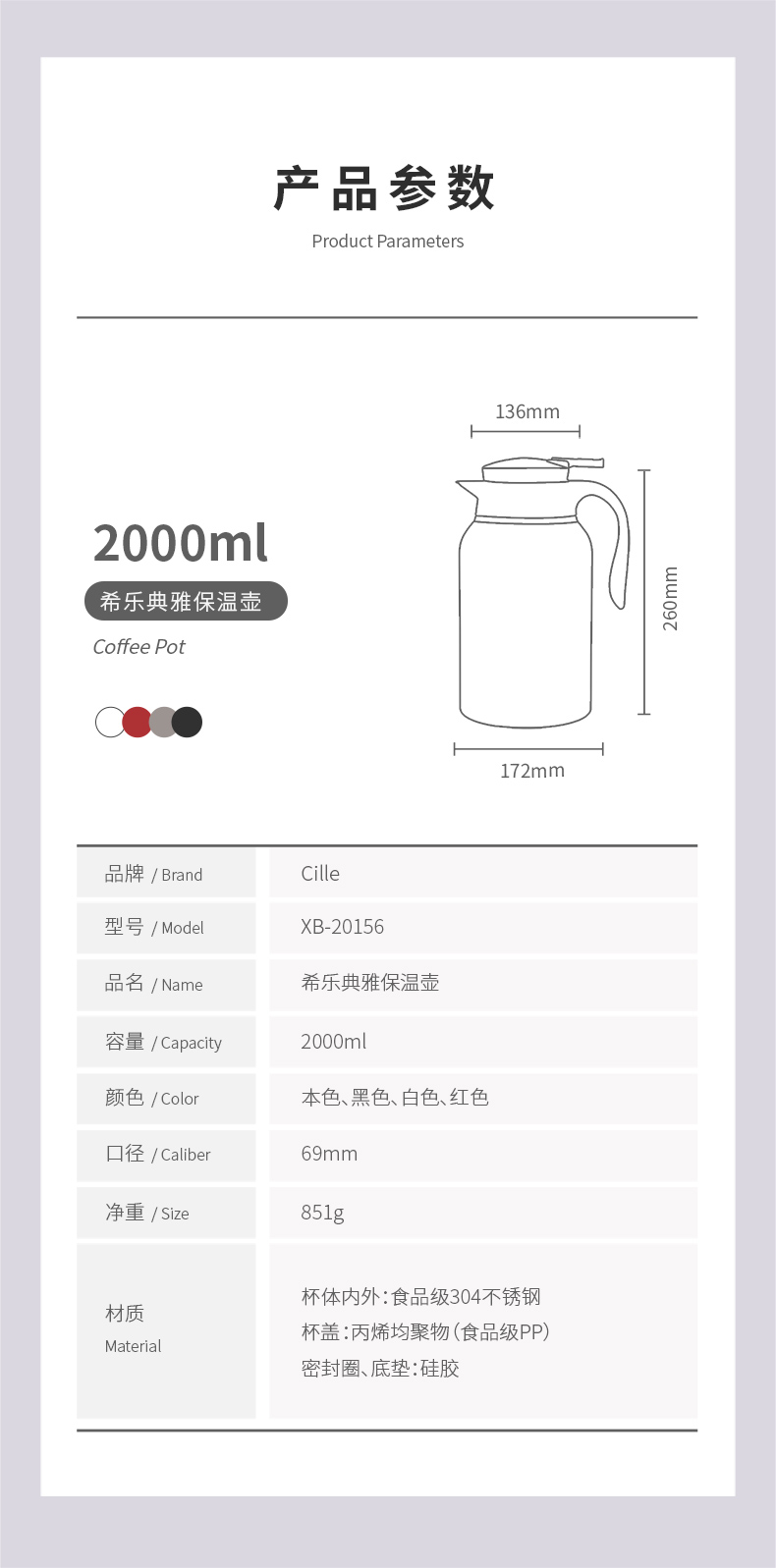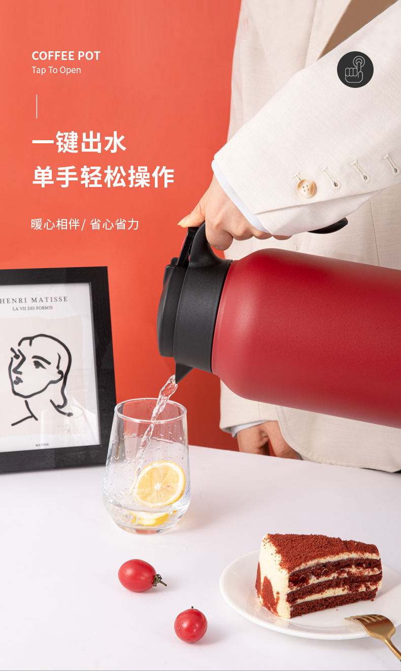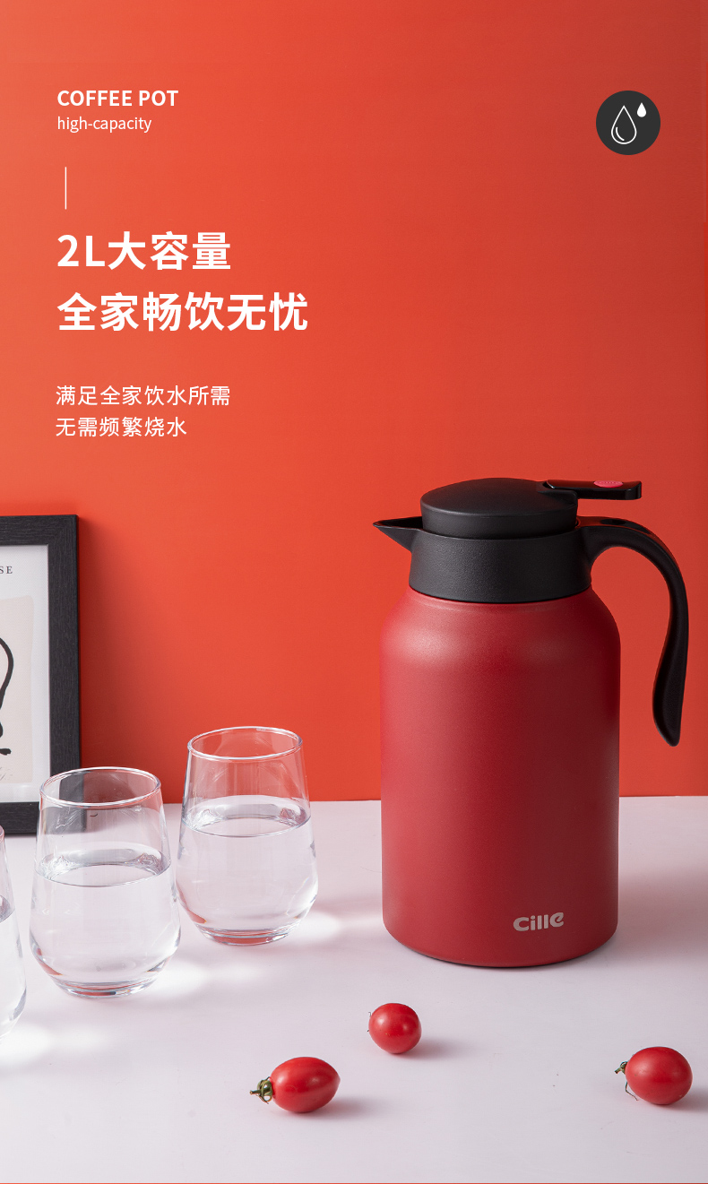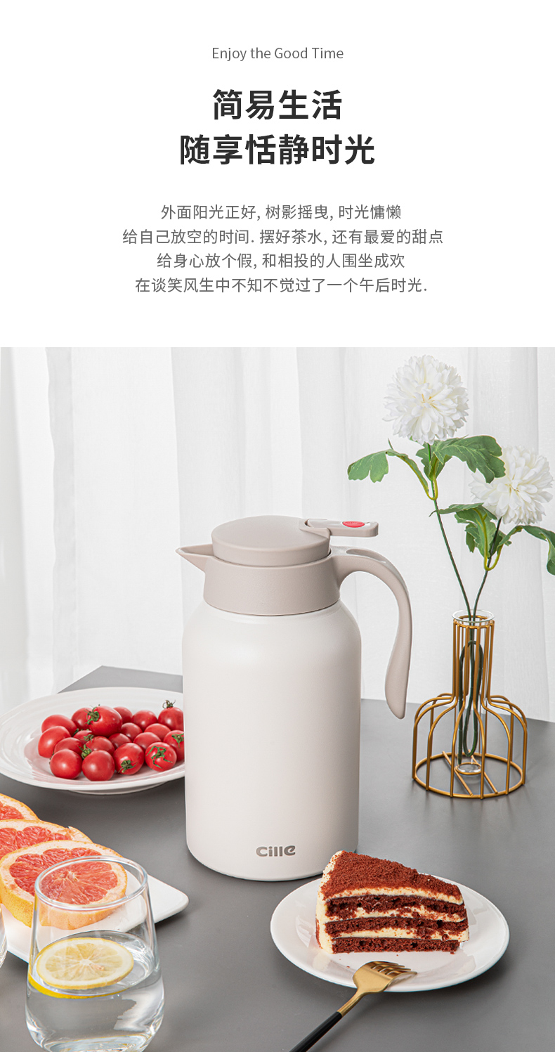 这款希乐 304不锈钢保温壶,食品级304不锈钢内胆,抗氧化、耐腐蚀、无异味。壶身是6层组合,外层喷漆、304不锈钢壶身、微波镀铜层、真空隔热保温层、304不锈钢内胆、电解研磨层,形成空间热层,锁住温度。