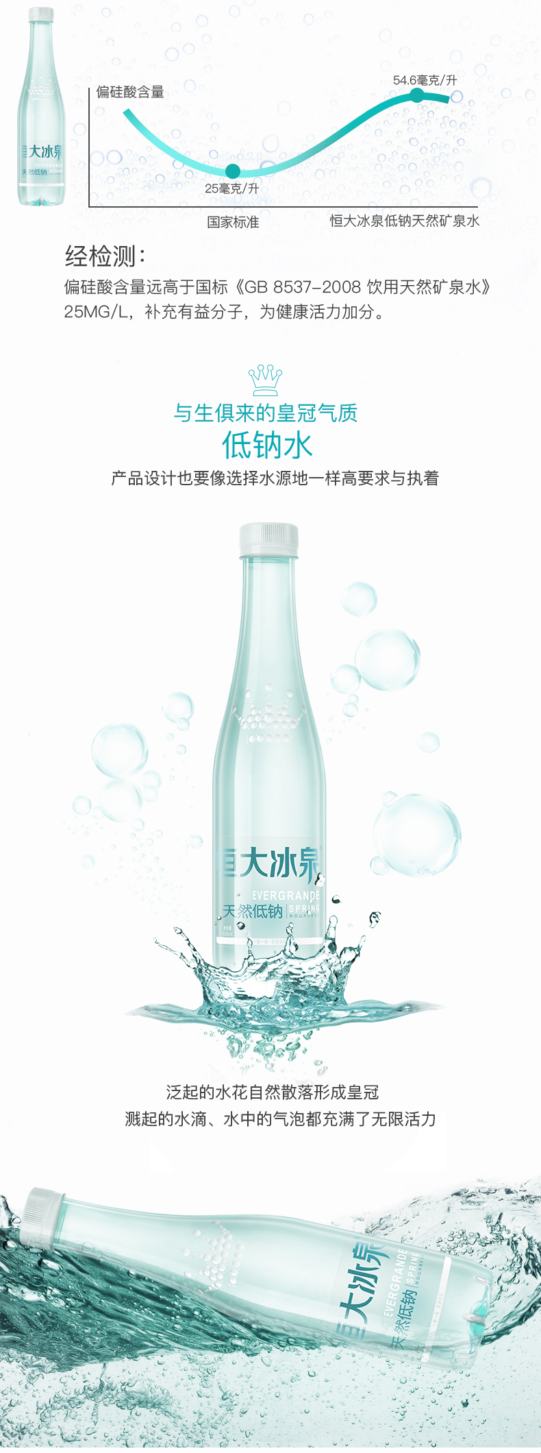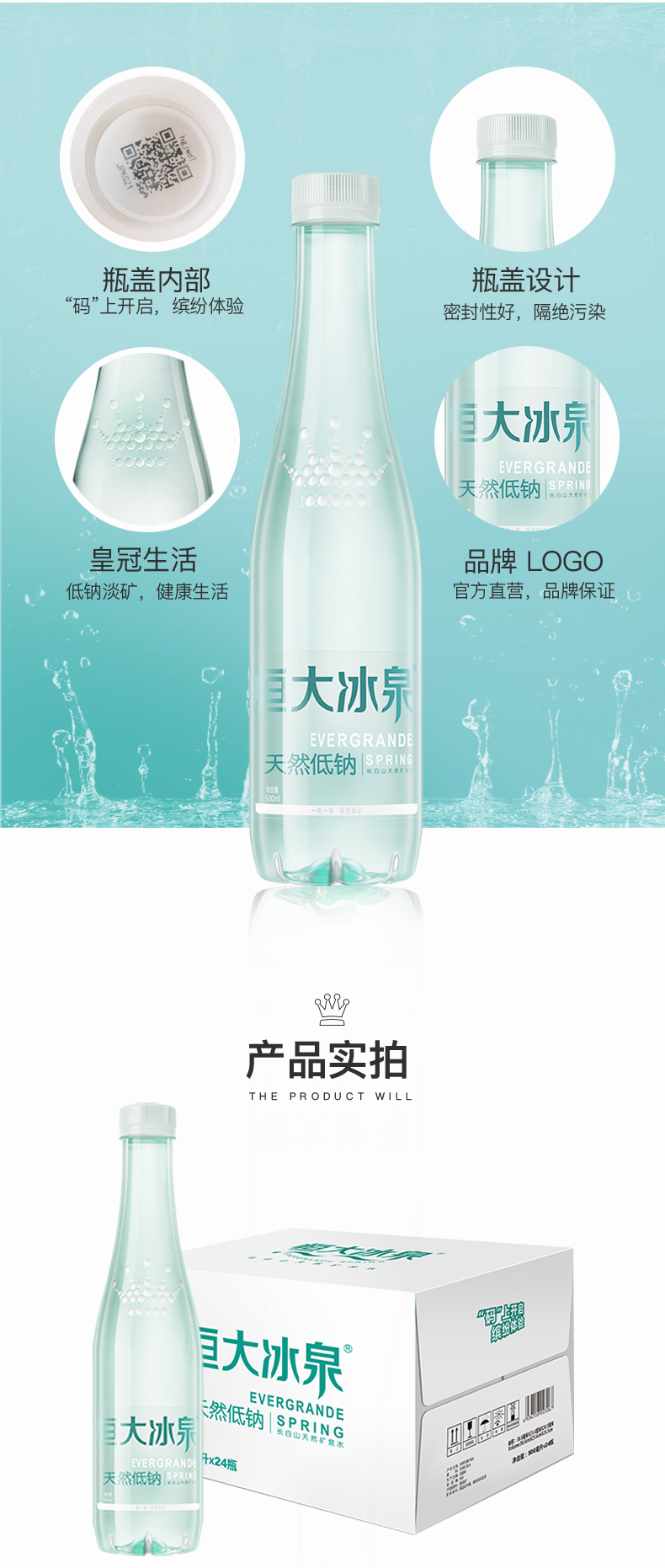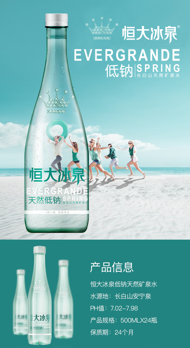 恒大冰泉经世界权威鉴定机构——德国Fresenius检测,鉴定结论为“口感和质量与世界著名品牌矿泉水相近,部分指标更优”。PH值7.02-7.98,弱碱性,更适合人体,富含丰富矿物质,健康安全。