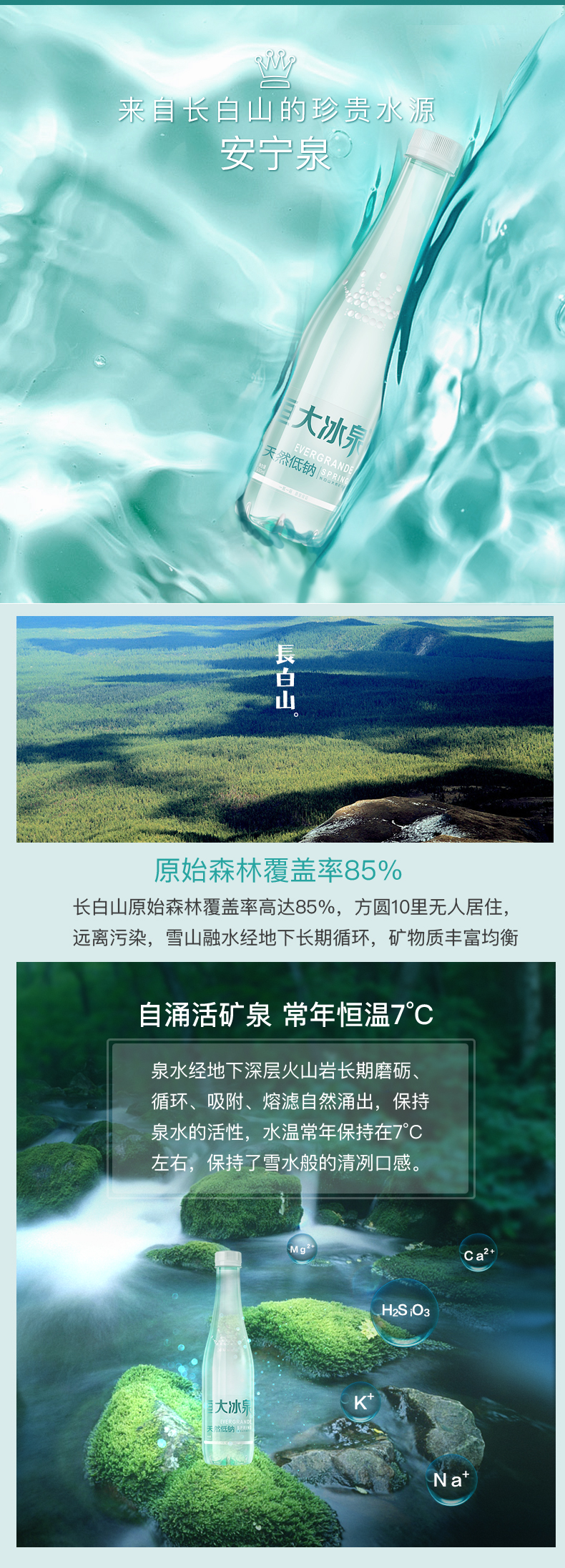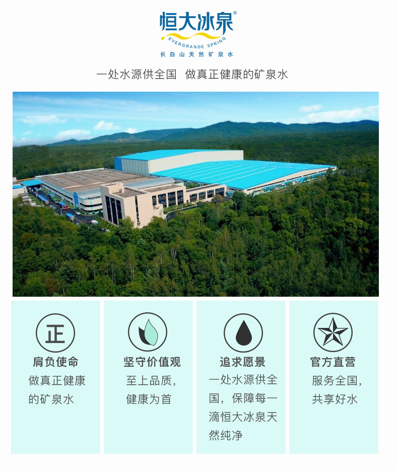 恒大冰泉的水源地为吉林省长白山深层矿泉,与欧洲阿尔卑斯山、俄罗斯高加索山一并被公认为世界三大黄金水源地。长白山深层矿泉,是经过地下千年深层火山岩磨砺,百年循环、吸附、溶滤而成,属火山岩冷泉。水温常年保持在6-8℃,水质中的矿物成分及含量相对稳定,水质纯净、零污染,口感温顺清爽。