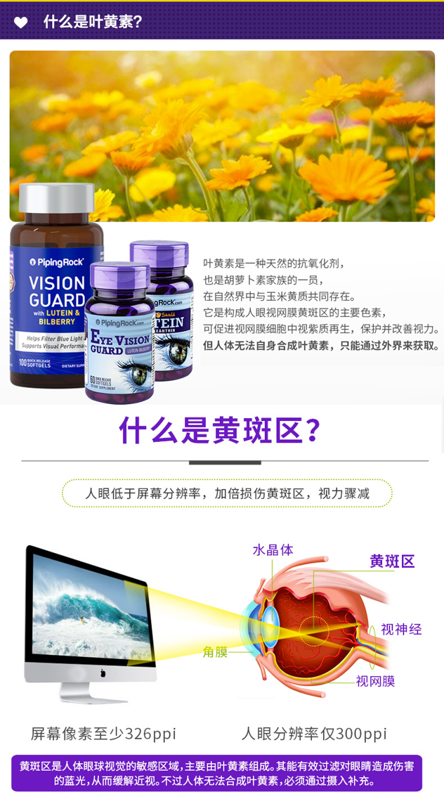 PipingRock 叶黄素胶囊,每片含40mg叶黄素,相当于24斤玉米含量,其活性成分玉米黄素高达1600mcg,远远高于市场同类品牌,吸收利用双效倍增,能有效缓解视疲劳症状(如视物模糊、眼干涩、眼胀、眼痛、畏光等,经常食用叶黄素者可预防重度近视及视网膜剥离,并有利于提高视力,还能大大降低冠心病及中风的发病率。
