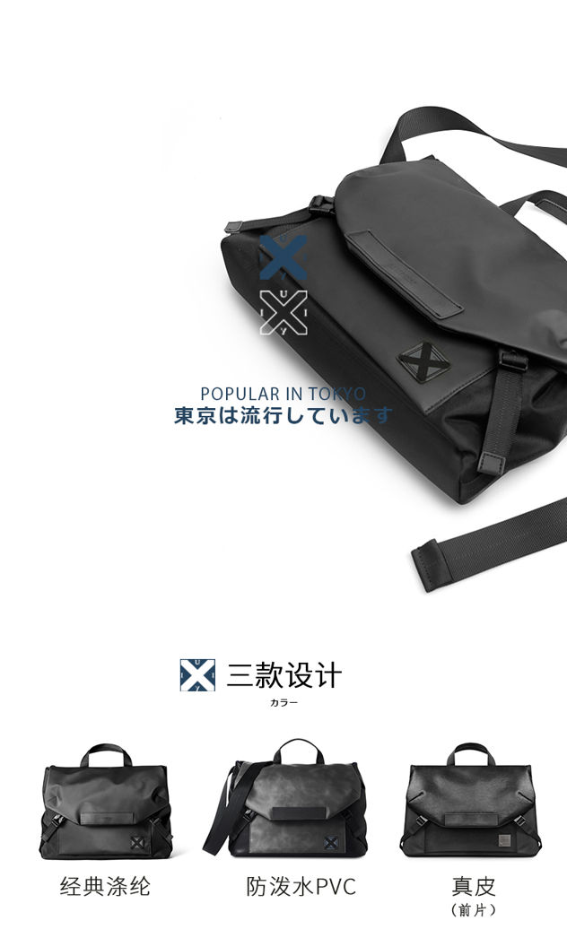 涤纶面料经过PVC涂层工艺,可有效防止水渗入,手感柔软,强韧耐磨。细节上包盖+搭扣双重安全保障,搭配定制的防盗铜质磁扣,便捷实用,可一秒开合。容量客观,内里合理分层布局,可收纳电脑,雨伞,杂志,水壶,钱包等多种杂物。