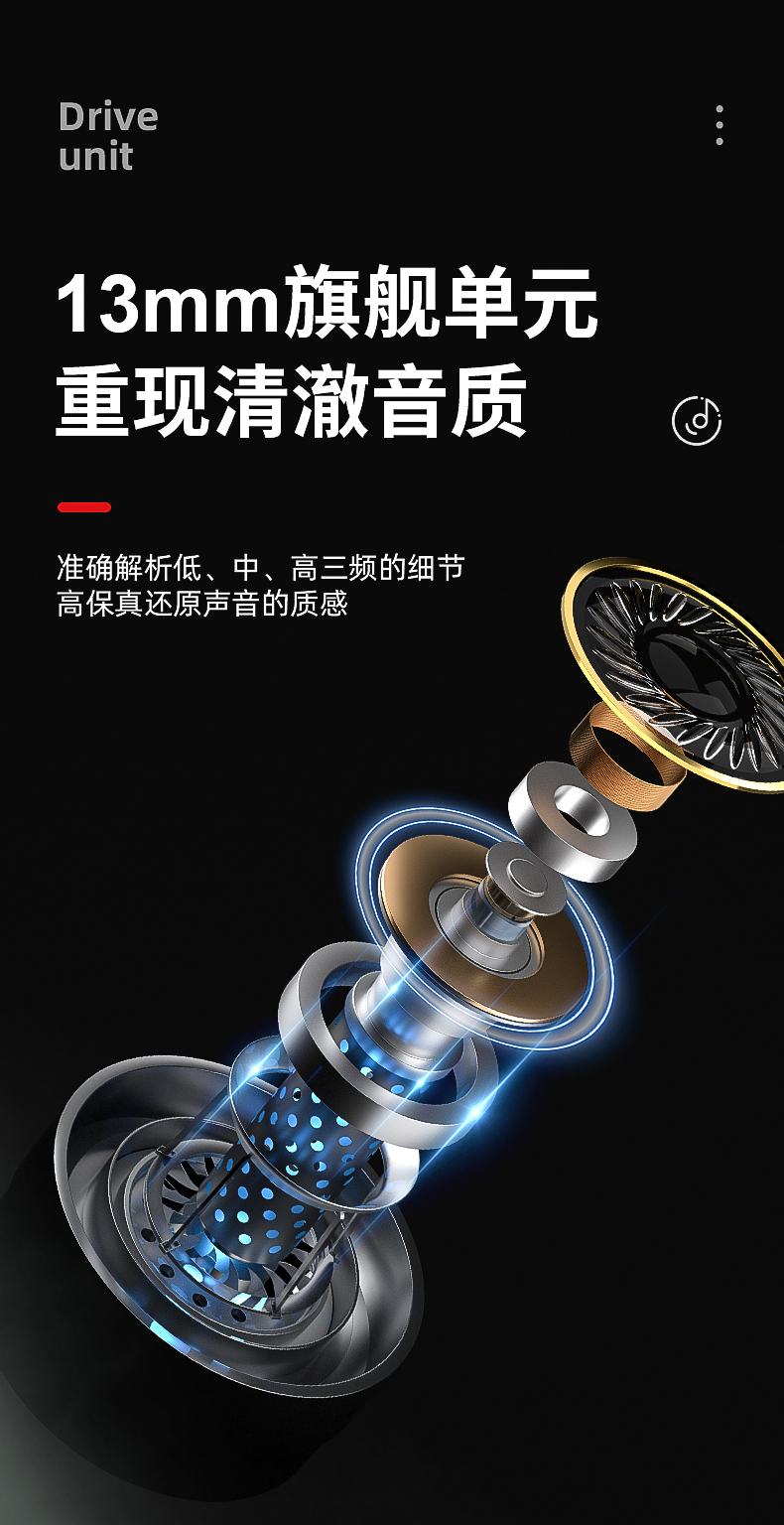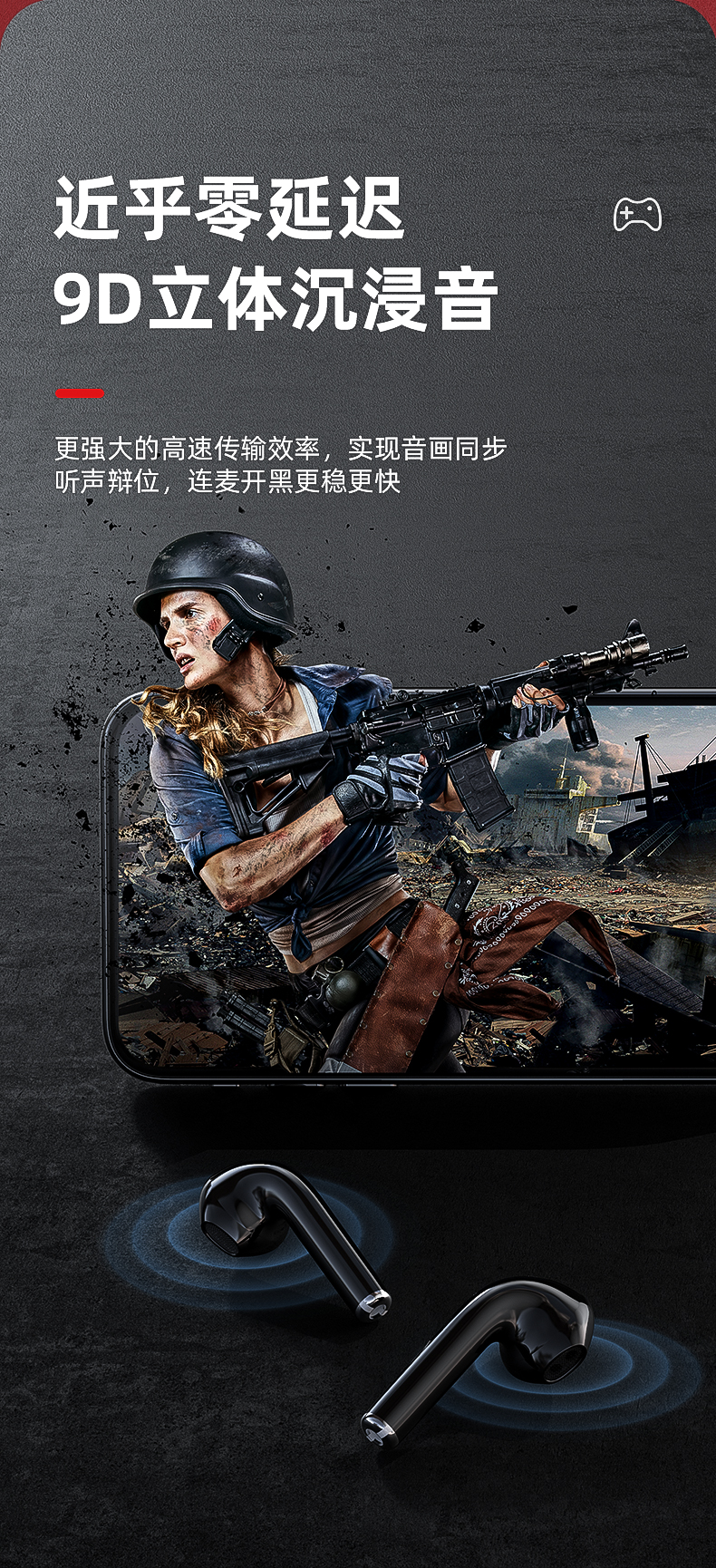内置蓝牙5.0高速芯片,连接迅速能耗低,支持指纹触控操作,触摸即可实现多种操控,高品质13mm旗舰单元,音质优秀,续航长达4小时,搭配充电仓使用,玩一整天也够用。