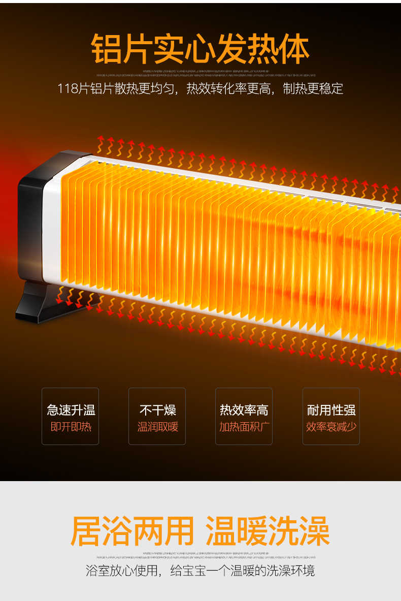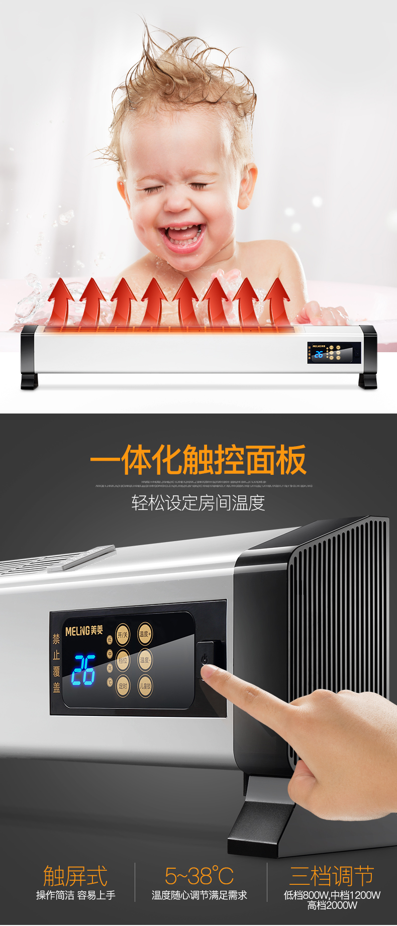 这款美菱踢脚线取暖器,118片铝片发热体,可立、可壁挂,移动方便,浴室也可用。有800W、1200W、2000W三档调节,加大加宽出风口,有效提高取暖效果,5-38度温度随心调节,合21-30㎡室内空间。
