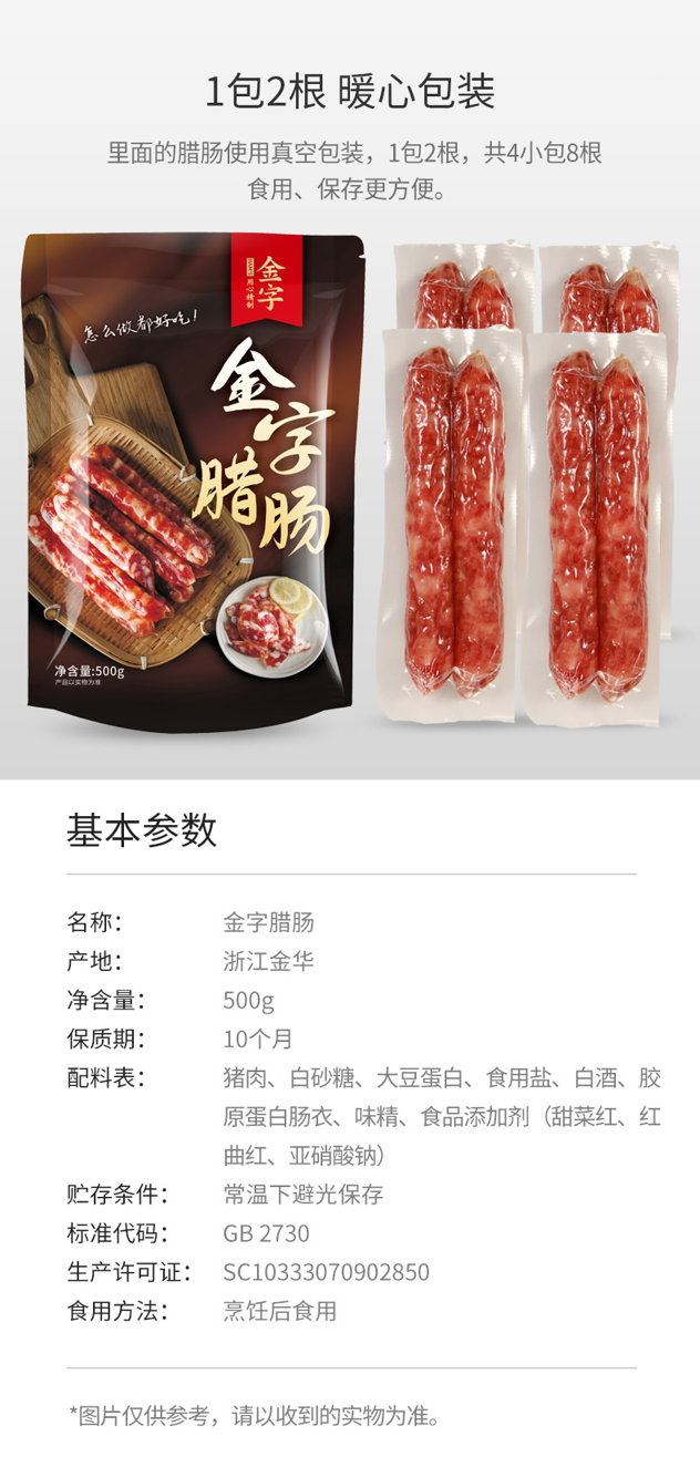 这款金字 广式腊肠香肠,精选肥瘦均匀好猪肉原料,采用地道的糖酒风味配方,以糖中和调味、嫩化肉质,以酒激发鲜味、增加醇香,造就鲜、香、微甜的风味。遵循传统腊肠制作技艺,历经十几道工序制成,外形紧致、色泽光润,肉质紧实有嚼劲。标准化生产车间,食用健康安全。规格:500g。