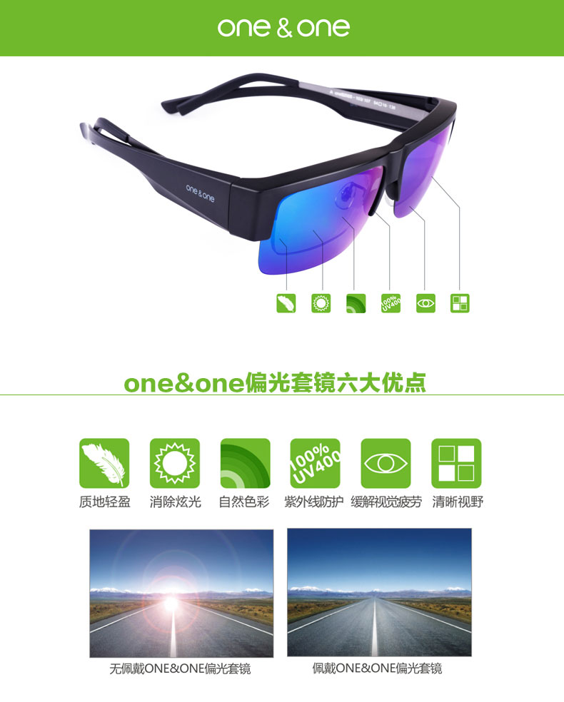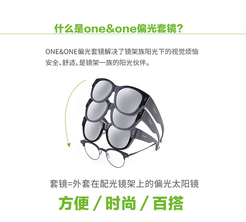 one&one的偏光套镜让近视人群可以轻松享受阳光视觉,解决近视人群的视觉烦恼。在线下占据近视太阳镜绝大部分的市场,是近视人群不可或缺的功能产品。