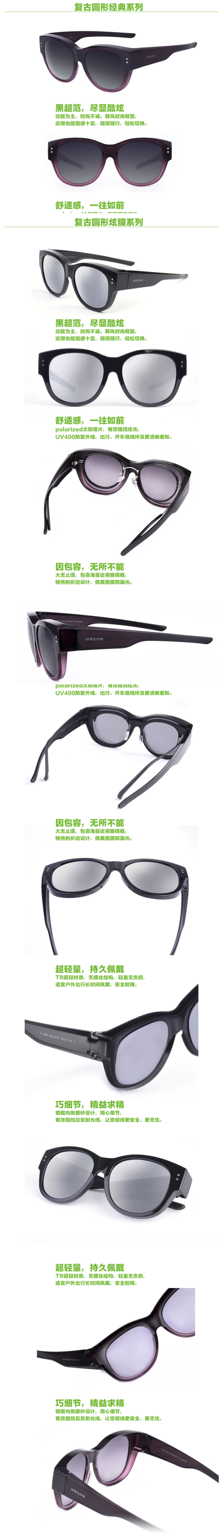 这款One&One 女偏光太阳镜是套镜,是专为近视患者设计的,可以直接套在近视的光学镜架上,对于近视的朋友来说非常友好。如果是隐形眼镜佩戴者或正常视力都可以直接佩戴,适合各类人群。
