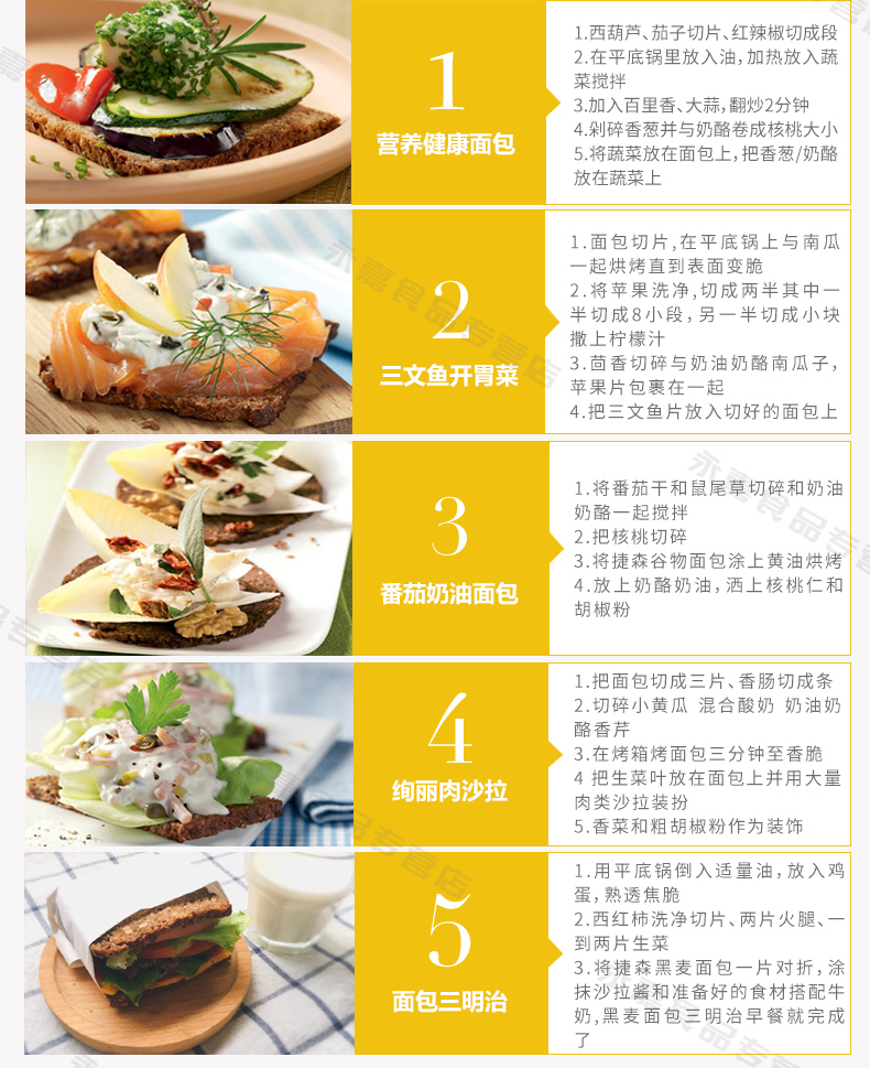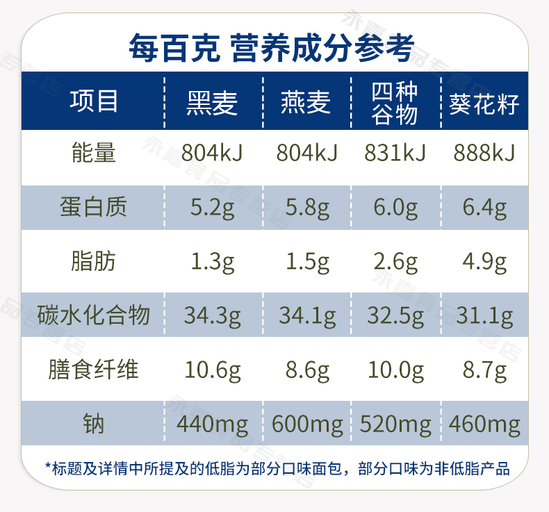 有黑麦面包、燕麦面包、四种谷物面包、葵花籽面包四种口味可选。