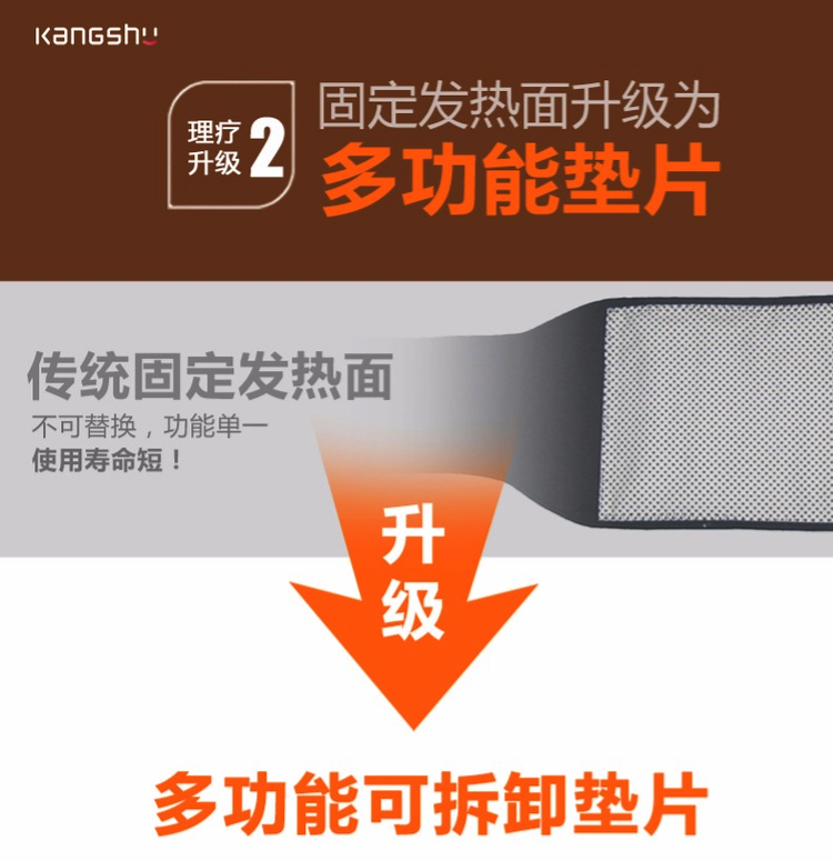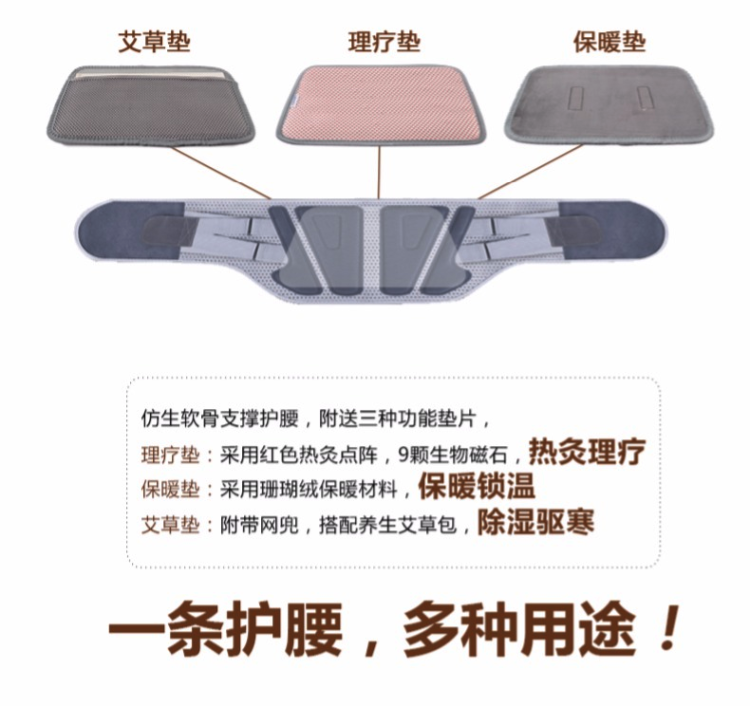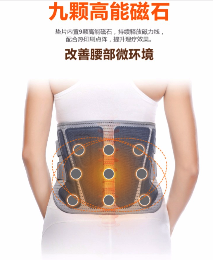 内置双向加力带,佩戴后辅助腰肌发力,缓解腰肌疲劳,新增护腰发热垫片,使用新一代热印刷点阵,发热速度快,使用寿命长,理疗保暖效果更好,垫片内置9颗高能磁石,持续释放磁力线,配合热印刷点阵,以达到良好的理疗效果,垫片可拆卸,可更换为保暖垫和艾草垫,可根据自己需求拆卸更换。