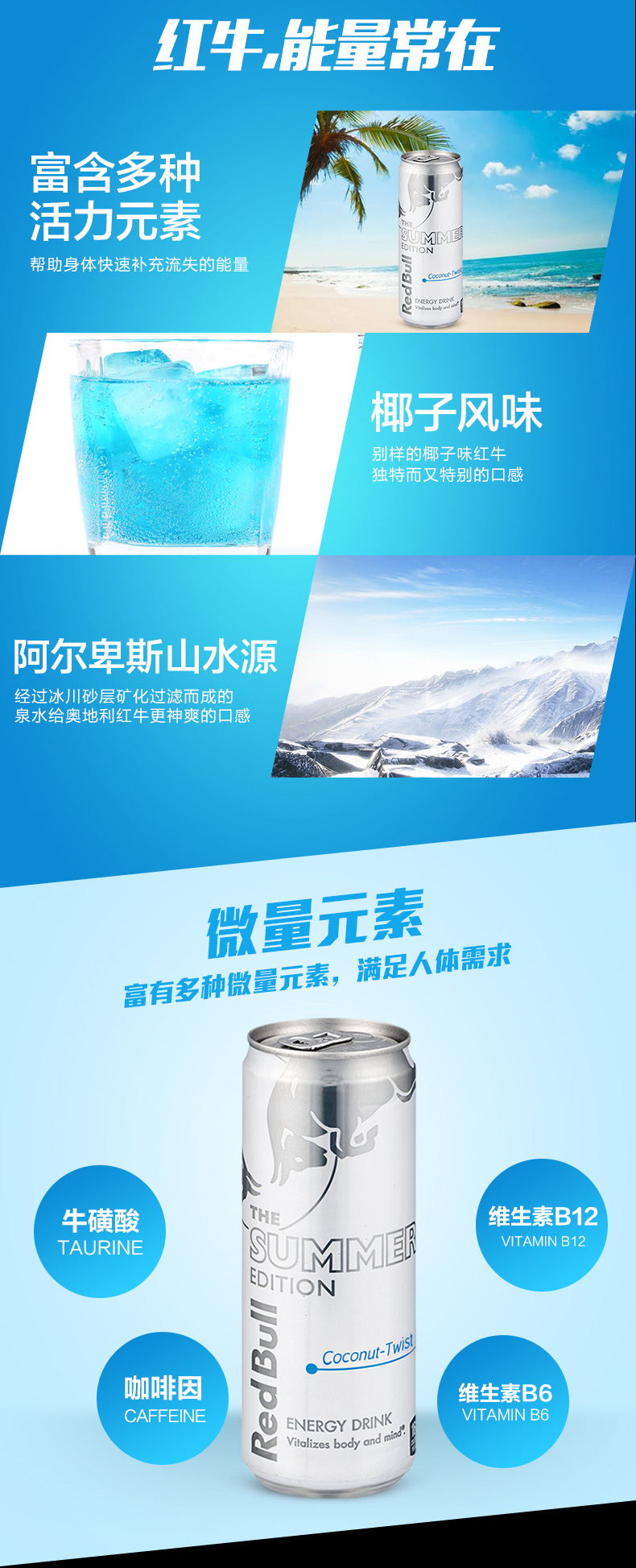 这款全新椰子风味功能饮料,奥地利原装进口,采用经过阿尔卑斯山的冰泉水为原料,远离污染和人为接触,流经矿物质层,富含牛磺酸、咖啡因、维生素B6和B12等多种微量元素,随时随地来一罐可补充能量,适合经常加班、熬夜、长时间驾车人群,可解除疲劳,提升精神。