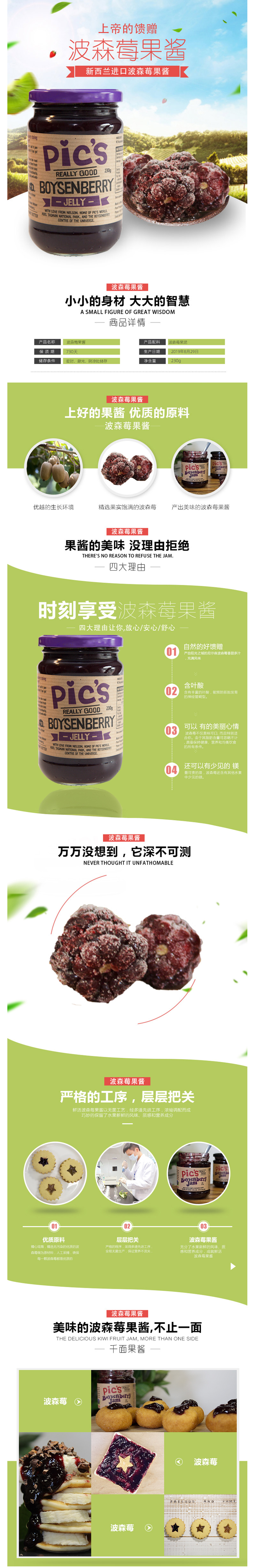 这款Pics天然波森莓果酱,新西兰原装进口,选用100%优质波森莓为原料,无任何添加剂,保证纯天然,果酱味美香甜、果香浓郁,可以用来烘焙、涂抹面包或者作为婴儿辅食。