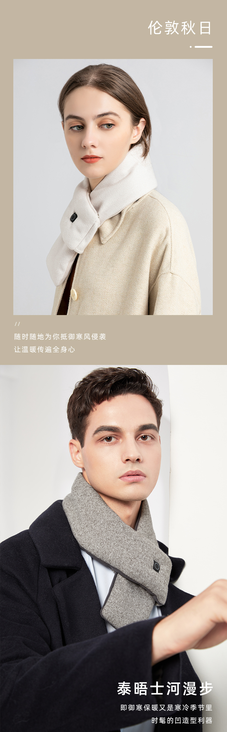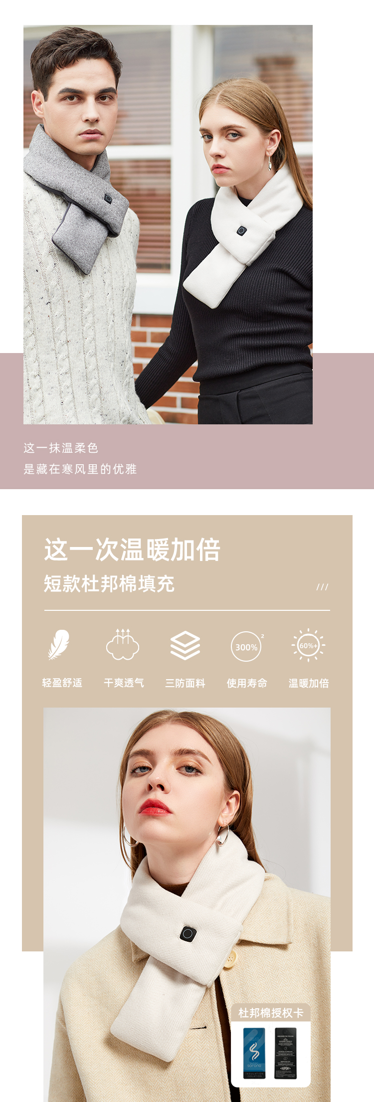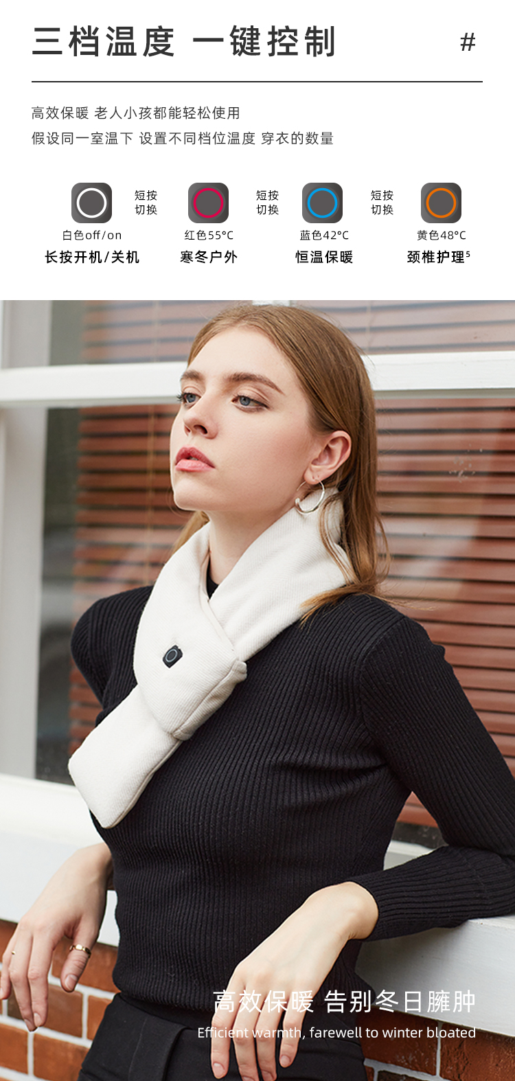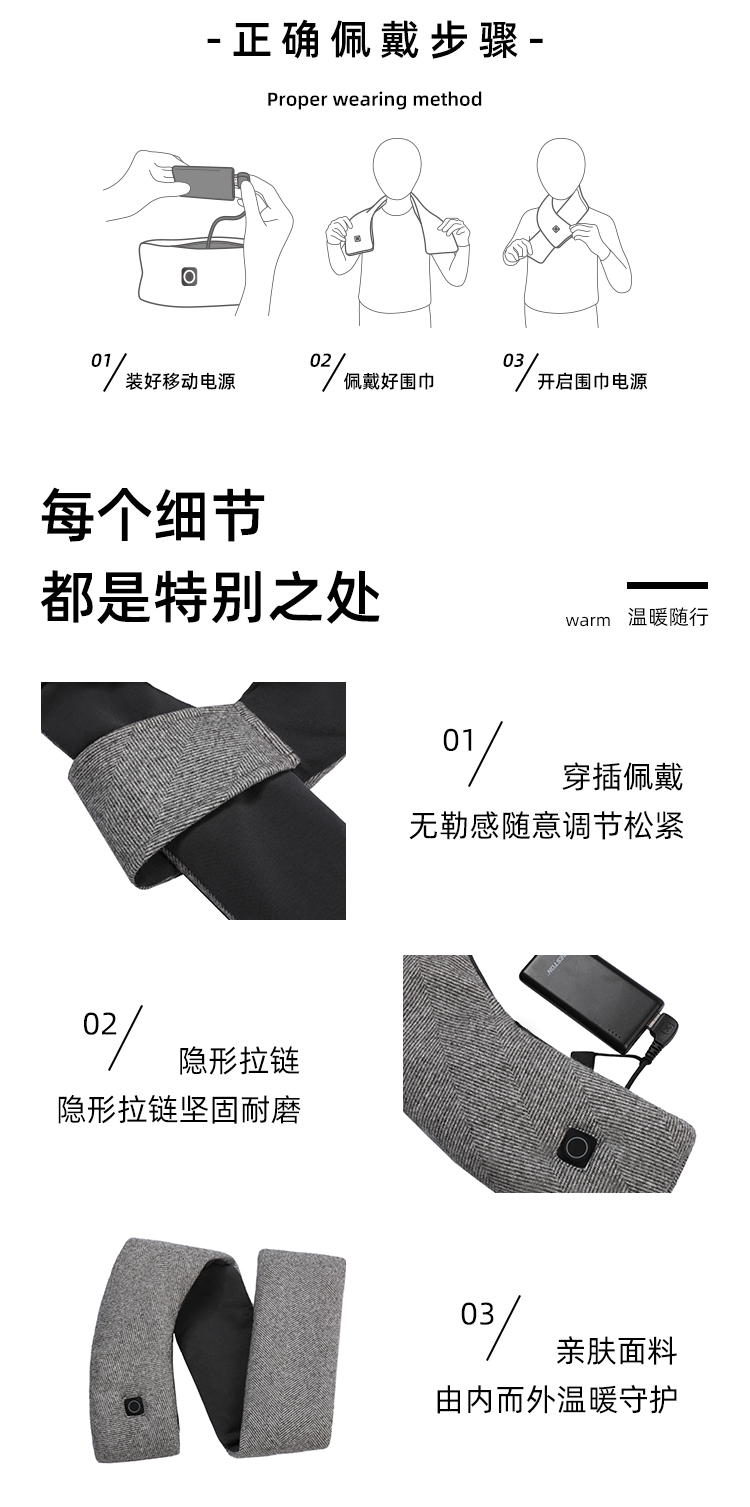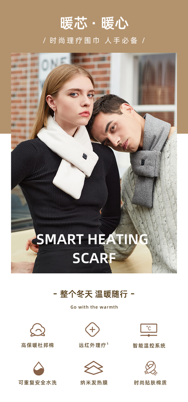 从颜值上来讲,也是目前为止最符合我审美的围巾,简洁不邋遢,短小精悍!电加热可水洗,符合我们追求方便的上班族习惯(就是懒)!内里填充杜邦棉,蓄热性能卓越,回弹性好,立体感强,恰到好处的环抱式设计,保暖周密。