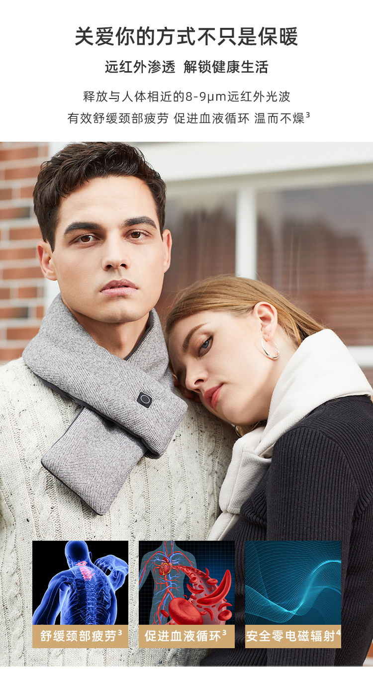 美的科技自发热围巾 热敷多档调节 温暖不论距离。发热围巾,除了保暖,还能起到颈椎保健的功效,时时刻刻热敷,缓解颈椎疲劳,冬季取暖神器!一键切换,3档温度可调,最高可达55度,可热水泡一个感受。